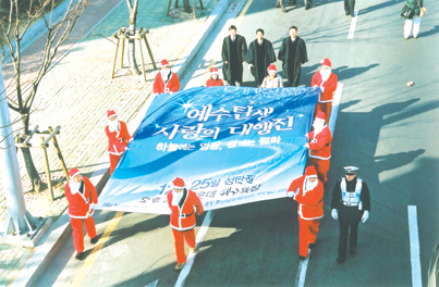 ¡®2003 ¿¹¼öź»ý »ç¶ûÀÇ ´ëÇàÁø¡¯Àº 12¿ù 25ÀÏ ºÎ»êÀÇ 300¿© ±³È¸°¡ Âü¿©ÇØ ÁغñµÈ º¹À½ ÇÇÄϰú Ä·ÆäÀμº ±¸È£¸¦ µé°í ÇàÁøÇÏ¿© ÃÖÁ¾Áý°áÁö·Î ¸ðÀÌ´Â °ÍÀ¸·Î ¼ºÅºÀý ±âµ¶±³ ¹®È­ °³ÇõÀÇ ½Ã¹ßÁ¡À¸·Î »ï°íÀÚ ÇÏ´Â Àǵµ¸¦ °¡Áö°í ÀÖ´Ù.