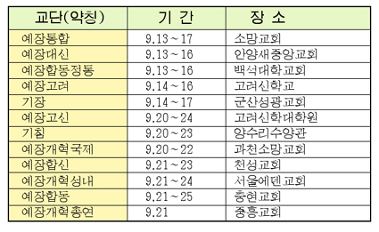 À̹ۿ¡ ¿¹Àå´ë½Å ÃÑȸ°¡ 13ÀϺÎÅÍ 16ÀϱîÁö ¾È¾ç»õÁß¾Ó±³È¸¿¡¼­, ¿¹ÀåÇÕµ¿Á¤ÅëÀÌ 13ÀϺÎÅÍ 16ÀϱîÁö õ¾È ¹é¼®´ëÇб³È¸¿¡¼­ °³ÃֵȴÙ. ¶Ç ´ÙÀ½³¯ÀÎ 14ÀÏ¿¡´Â ±âÀå ÃÑȸ°¡ ±º»ê¼º±¤±³È¸¿¡¼­, ¿¹Àå°í·ÁÃÑȸ°¡ °í·Á½ÅÇб³¿¡¼­ ÃÑȸ¸¦ °®´Â´Ù.