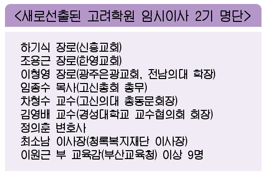 ±³À°ÀÎÀûÀÚ¿øºÎ´Â Áö³ 2ÀÏ Çб³¹ýÀÎ °í·ÁÇпø¿¡ Á¦2±â Àӽà À̻縦 »õ·Ó°Ô ÀÓ¸íÇß´Ù. À̹ø¿¡ ÀÓ¸íµÈ ÀÓ½ÃÀÌ»ç´Â Çϱâ½Ä Àå·Î(ºÎ»ê´ë ÀºÅð±³¼ö, ½ÅÈﱳȸ), Á¶¿ë±Ù Àå·Î(Àü Áö¹æ±¹¼¼Ã»Àå, ÇÑ¿µ±³È¸), ÀÌÇü¿µ Àå·Î(±¤ÁÖÀº±¤±³È¸, Àü³²ÀÇ´ë ÇÐÀå), ÀÓÁ¾¼ö ¸ñ»ç(°í½ÅÃÑȸ Ãѹ«)µî 4¸íÀÇ ±³´ÜÀλç¿Í Â÷Çü¼ö ±³¼ö(°í½ÅÀǴ뵿¹®È¸Àå), ±è¿µ¹è ±³¼ö(°æ¼º´ë ±³¼öÇùÀÇȸ ȸÀå), Á¤ÀÇÈÆ º¯È£»ç, ÃÖ¼Ò³² ÀÌ»çÀå(û·Ïº¹ÁöÀç´Ü ÀÌ»çÀå)µî ±³¼öÆòÀÇȸ¿Í ³ëµ¿Á¶ÇÕÀÌ ÃßõÇÑ Àλç¿Í ±³À°ÀÎÀûÀÚ¿øºÎ°¡ ¼±ÀÓÇÑ ÀÌ¿ø±Ù ºÎ»ê½Ã ºÎ±³À°°¨µî ÃÑ 9¸íÀ» »õ·Ó°Ô ÀÓ¸íÇß´Ù.