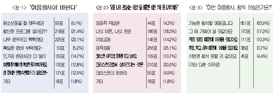 ¶Ç ±Ý³â ¿©¸§ Çà»ç¿¡ ¹Ù¶ó´Â ³×ƼÁðµéÀÇ ÀǰßÀº ¡®¼ö·Ãȸ ÀÏÁ¤ÀÌ ³Ê¹« ºýºýÇÏ´Ù¡®(22.1%), ¡®Âü½ÅÇÑ ÇÁ·Î±×·¥¡®(21.4%), ¡®¶ß°Å¿î Âù¾çÀ» ´õ ¸¹ÀÌ¡®(14.7%)¼øÀ¸·Î Á¶»çµÆ´Ù.