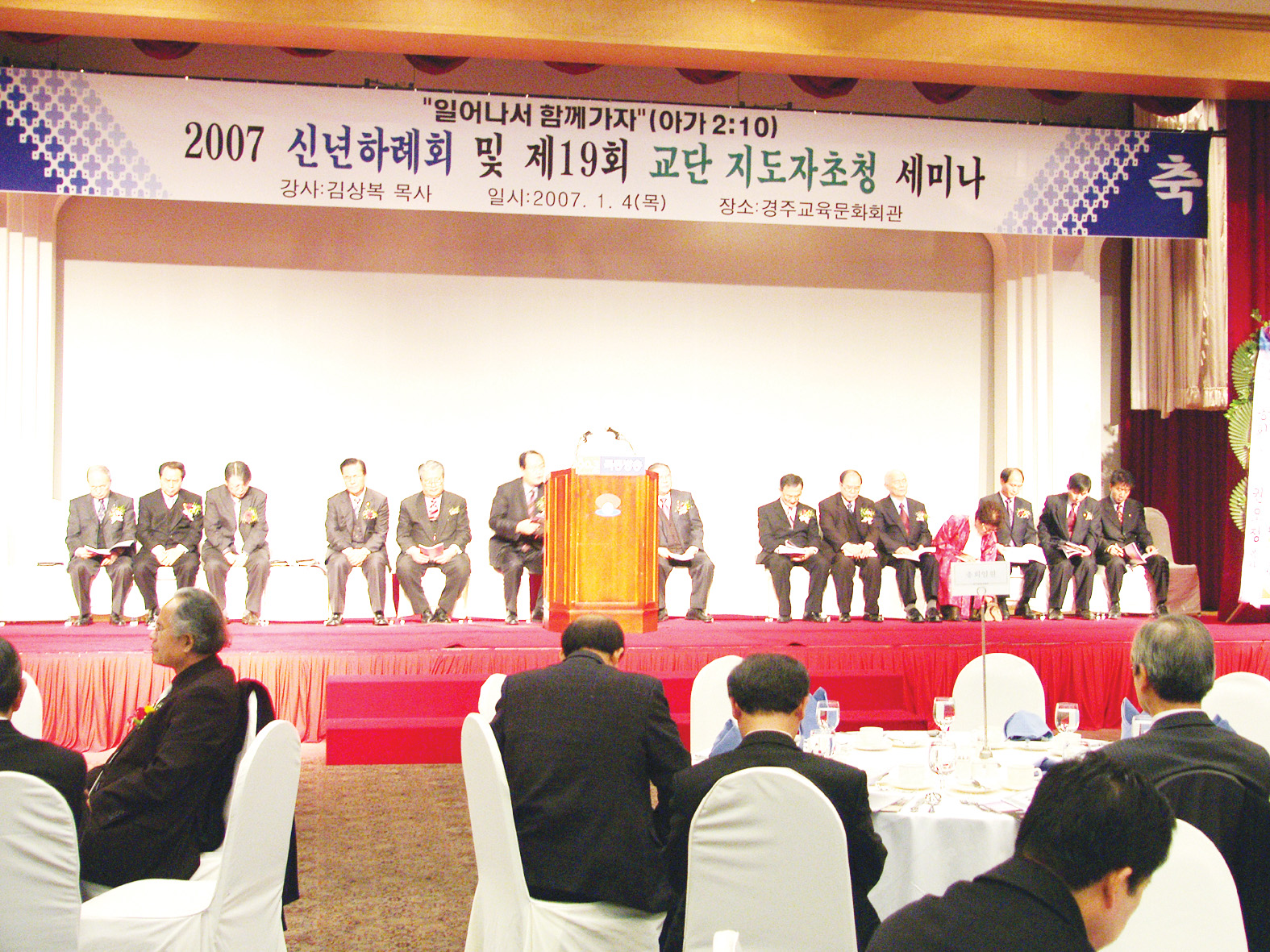 2007³âÀ» ¸Â¾Æ ±³°è ¶Ç´Â ±³´Ü¸¶´Ù ½Å³âÇÏ·Êȸ°¡ ÁÙÀ» ÀÕ°í ÀÖ´Ù. ±Ý³â ½Å³âÇÏ·Êȸ´Â 1907³â »õÇØ ´ö´ãÀ» ³ª´©¸ç 2007³âµµ°¡ Çѱ¹±³È¸ ºÎÈïÀ» ÀçÇöÇÏ´Â ÇÑÇØ°¡ µÇ±â¸¦ °£ÀýÈ÷ ¼Ò¿øÇÏ¸é¼ ¾î·Á¿î Çö¾È ¹®Á¦°¡ ±Ý³â¿¡´Â ²À ÇØ°áµÇ±â¸¦ ÇÕ½ÉÇØ ±âµµÇÏ´Â ½Ã°£ÀÌ µÇ°í ÀÖ´Ù. Çѱ¹±âµ¶±³ÃÑ¿¬ÇÕȸ(´ëǥȸÀå ¹ÚÁ¾¼ø ¸ñ»ç)´Â Áö³ 2ÀÏ ½Å³âÇÏ·Êȸ¿Í Á¦5ȸ ÇѱâÃÑ ¹®È¿¹¼ú¼±±³´ë»ó ½Ã»ó½ÄÀ» Çѱ¹±âµ¶±³¿¬ÇÕȸ°ü¿¡¼ »êÇÏ ±³´ÜÀÎ»ç ¾à 4¹é¿©¸íÀÌ Âü¼®ÇØ ¼ºÈ²¸®¿¡ µå·È´Ù. ´ëǥȸÀå ¹ÚÁ¾¼ø ¸ñ»ç´Â ¡°»çÇйý Àç°³Á¤¹®Á¦°¡ ±Ý³â¿¡´Â ²À ½ÇÇöµÇ±â¸¦ ¿øÇÑ´Ù¡±¸ç Çö Çѱ¹±³È¸ÀÇ ÃÖ´ë ȵΰ¡ µÇ°í ÀÖ´Â ¹®Á¦¸¦ Á÷Á¢ÀûÀ¸·Î °Å·ÐÇϸç Çѱ¹±³È¸ÀÇ ¹Ù·¥´ë·Î ¡®Àç°³Á¤¡¯ÀÌ ÀÌ·ç¾îÁö±æ °£ÀýÈ÷ ¼Ò¿øÇß´Ù. ¶Ç ¡®±¹°¡¿Í ¹ÎÁ·À» À§ÇÏ¿©¡¯(ÇÑ⿵ ¸ñ»ç), ¡®Çѱ¹±³È¸ ºÎÈï¹ßÀüÀ» À§ÇÏ¿©¡¯(ÇÑ¸í±¹ ¸ñ»ç), ¡®ÇѱâÃѰú ±³È¸ÁöµµÀÚ¸¦ À§ÇÏ¿©¡¯(±èºÀÅ ¸ñ»ç)¶ó´Â Á¦¸ñÀ¸·Î Ưº°±âµµÇÏ´Â ½Ã°£À» °¡Á³´Ù.