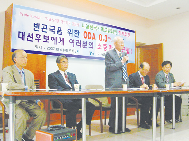 ±âµ¶±³»çȸåÀÓ(°øµ¿´ëÇ¥ À̱¤¼± ¸ñ»ç), ±¹Á¦±â¾Æ´ëÃ¥±â±¸(Á¤Á¤¼· ȸÀå), ¾Æ½Ã¾ÆÇù·Â±â±¸(ÀÌÁØ ÀÌ»çÀå), CMI(´ëÇ¥ ±è¿äÇÑ ¸ñ»ç)µî 4°³ ±âµ¶±³´ÜüµéÀº Áö³ 4ÀÏ, ±âµ¶±³»çȸåÀÓ ¼¼¹Ì³ª½Ç¿¡¼ ÀÚ¶û½º·¯¿î ´ëÇѹα¹ ¸¸µé±â Pride Korea ¿îµ¿ÀÇ ÀÏȯÀ¸·Î ¿ì¸®³ª¶óÀÇ ODA(°øÀû°³¹ß¿øÁ¶ÀÚ±Ý)¸¦ 0.3%·Î Áõ¾×Çϵµ·Ï ÇÏ´Â ¡®³ª´®Çѱ¹±âµ¶±³Ä·ÆäÀΡ¯À» 17´ë ´ë¼±±â°£ µ¿¾È Àü°³Å°·Î ÇÏ´Â ±âÀÚȸ°ßÀ» °¡Á³´Ù. ÇöÀç 2006³â Çѱ¹ÀÇ ODA(°øÀû°³¹ß¿øÁ¶)´Â GNI(1Àδ籹¹Î¼Òµæ)ÀÇ 0.05%·Î OECD °¡ÀÔ±¹ 30°³±¹ Áß 26À§ÀÌ´Ù. ÀÌ·¯ÇÑ °á°ú´Â, 1À§ ½º¿þµ§ÀÇ 1.03%¿Í À¯¿£ÀÇ ±Ç°íÄ¡ÀÎ 0.7%, OECD Æò±Õ 0.3% ¿Í ºñ±³ÇØ º¼ ¶§ ¼¼°è 11À§ÀÇ Çѱ¹°æÁ¦ ±Ô¸ð¿¡ ºñÇϸé ÅξøÀÌ ºÎÁ·ÇØ °¢¼ºÀÇ ¸ñ¼Ò¸®°¡ ³ô´Ù. µû¶ó¼ ¡®³ª´®Çѱ¹±âµ¶±³Ä·ÆäÀΡ®Àº ÇâÈÄ 17´ë ´ëÅë·É ÀÓ±â Áß(2012³â)¿¡ OECDÆò±ÕÀÎ 0.3% ÀÌ»óÀÌ µÇµµ·Ï ¸ñÇ¥¸¦ ¼³Á¤Çϰí, ´ëÅë·É Èĺ¸µé¿¡°Ô 0.3%¸¦ ´ë¼±°ø¾àÀ¸·Î ¹Þ¾ÆµéÀ̵µ·Ï ±ÇÀ¯ÇØ À̸¦ °ø¾àÀ¸·Î ¹Þ¾ÆµéÀÌ´Â È常¦ ÁöÁöÇÏÀÚ´Â À¯±ÇÀÚ Ä·ÆäÀÎÀ» Àü°³ÇÒ ¿¹Á¤ÀÌ´Ù. ÀÌ Ä·ÆäÀÎÀº ±âµ¶±³¸¦ Áß½ÉÀ¸·Î ÁøÇàµÇ¸ç ¼±°Å ½Ã±â±îÁö 30¸¸ ¸íÀ» ¸ñÇ¥·Î ¼¸íÀ» ¹Þ¾Æ °¢ Èĺ¸µé¿¡°Ô Å뺸ÇÒ °èȹ¿¡ ÀÖ´Ù.