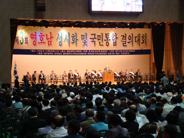 Áö³ 11ÀÏ ±¤ÁÖ È£³²´ëÇб³ üÀ°°ü¿¡¼ °³ÃÖµÈ Á¦3ȸ ¿µÈ£³²ÇѸ¶À½¼º½ÃÈ´ëȸ(°øµ¿´ëȸÀå Á¤¿øÈñ ¸ñ»ç(È£³²), ¹Ú¼ø¿À ¸ñ»ç(¿µ³²))°¡ ¿µÈ£³² Áö¿ª 8°³½Ãµµ ¼º½Ãȿº»ºÎ °ü°èÀÚ¿Í ¼ºµµ µî ¾à 3000¿©¸íÀÌ ¸ð¿© ±¹¹ÎÅëÇÕ°ú ¼º½ÃȿÀ» À§ÇØ ¶ß°Ì°Ô ±âµµÇß´Ù.