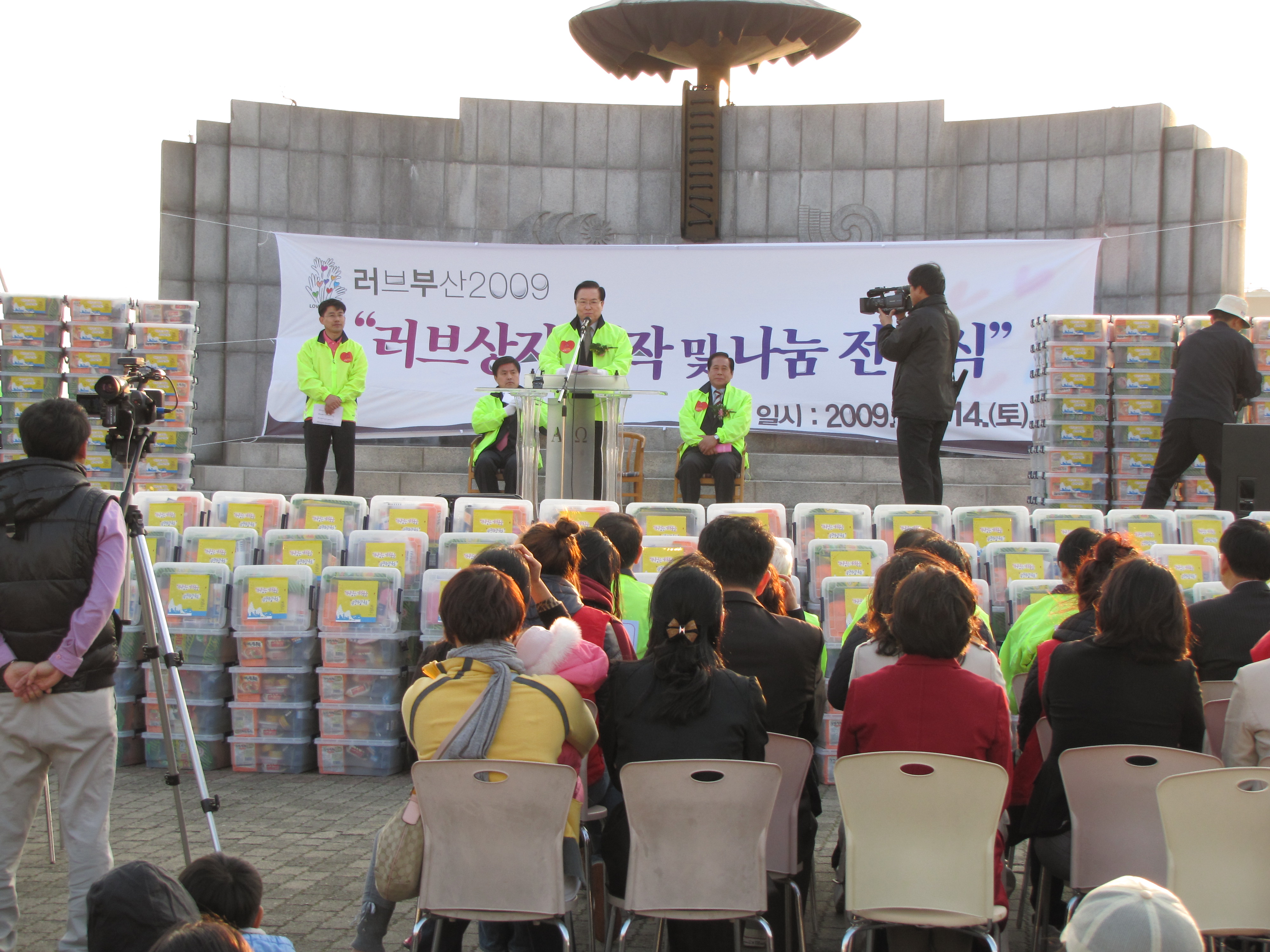 ÀÌ·¸°Ô 2½Ã°£¿¡ °ÉÃÄ ÁøÇàµÈ ·¯ºê»óÀÚ 1¸¸°³°¡ ¿ÀÈÄ 4½Ã ºÎ»êÁö¿ª 52°³ º¹Áö°ü ¹× ±¸Ã», µ¿»ç¹«¼Ò¿¡ Àü´ÞµÆ´Ù. À̳¯ ·¯ºê»óÀÚ Àü´Þ½ÄÀº Á¤Çʵµ ¸ñ»çÀÇ ±Ç¸é, Çã³²½Ä ºÎ»ê½ÃÀåÀÇ °Ý·Á»ç, ¹è´ö±¤ ÇØ¿î´ë±¸Ã»ÀåÀÇ Ãà»ç·Î À̾îÁ³´Ù. Á¤Çʵµ ¸ñ»ç´Â ¡°Çѱ¹ÀÌ ±¹¹Î¼Òµæ 2¸¸ºÒÀ» ÇâÇØ ´Þ·Á°¡°í ÀÖÁö¸¸ ¾ÆÁ÷µµ ³¢´Ï¸¦ °ÆÁ¤ÇÏ¸ç °í´ÜÇÑ »îÀ» À̾´Â ÀÌ¿ôµéÀÌ ¸¹´Ù. ºÎ»êÀ̶ó´Â °°Àº ÇÏ´Ã ¾Æ·¡ »ì¾Æ°¡¸é¼ À̵éÀ» ¸ð¸¥ ô ÇÒ ¼ö ¾ø´Â ±î´ßÀº ¡®³ª´®°ú ¼¶±è¡¯ÀÌ ¿ì¸® Å©¸®½ºÃµµéÀÇ »ç¸íÀ̱⠶§¹®ÀÌ´Ù. ·¯ºê»óÀÚ´Â ´õ ¸¹Àº À̵é°ú ³ª´©°íÇ ¸¶À½À¸·Î ½ÃÀÛÇÏ´Â ·¯ºêºÎ»ê 2009ÀÇ ÇÙ½ÉÇÁ·ÎÁ§Æ®¡±¶ó°í ¸»Çß´Ù.