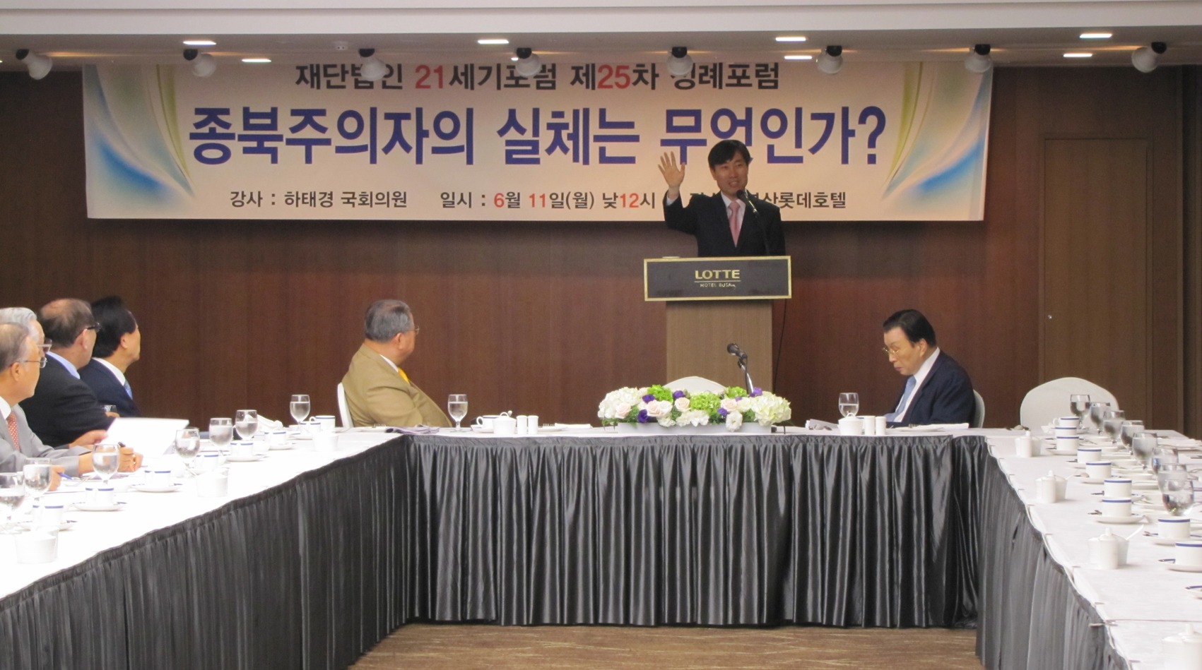 Á¤¼º¸¸ ÀÌ»çÀåÀÇ °³È¸Àλç¿Í °»ç¼Ò°³·Î ½ÃÀÛÇÑ À̳¯ Æ÷·³Àº ÇÏÅÂ°æ ±¹È¸ÀÇ¿øÀÌ °»ç·Î ³ª¼ ÁÖÁ¦¹ßÇ¥¸¦ Çß´Ù. ÇÏÅÂ°æ ±¹È¸ÀÇ¿øÀº Á¾ºÏ¼¼·ÂÀ» ¼³¸íÇϸç, ¡®Á¾ºÏ¡¯°ú ¡®Ä£ºÏ¡¯À̶õ ´Ü¾î´Â ±¸ºÐµÅ »ç¿ëÇØ¾ß ÇÑ´Ù°í ¼³¸íÇß´Ù. 1980³â´ë Çлý¿îµ¿ÀÇ ¿µÇâÀ» ¹ÞÀº Çö 30~40¼¼´ë ±¹¹Îµé¿¡°Ô´Â Á¾ºÏÀÌ ¾Æ´Ñ Ä£ºÏ ¼ºÇâÀÌ ¾ÆÁ÷µµ ³²¾ÆÀÖ´Ù¸é¼, À̵éÀÌ ¿©·ÐÀ» Çü¼ºÇÏ´Â ÁÖ¿ä¼¼´ëµéÀ̱⠶§¹®¿¡ Á¾ºÏÁÖÀÇ¿Í ºÏÇÑÀÇ ½Ç»óÀ» ±¹¹Îµé¿¡°Ô ¾Ë¸®´Â °ÍÀÌ Áß¿äÇÏ´Ù°í ¼³¸íÇß´Ù. ¶ÇÇÑ Á¾ºÏÁÖÀÇÀÚµéÀº ºÏÇÑÀÇ À̳äÀ» ¸Í¸ñÀûÀ¸·Î µû¸£±â ¶§¹®¿¡, ÀڽŵéÀÇ À̳äÀ» ¼û±ä ä ¹Ý¹Ì ¹ÝÀÏÀ» ÁÖÀåÇÑ´Ù°í ¸»Çß´Ù.