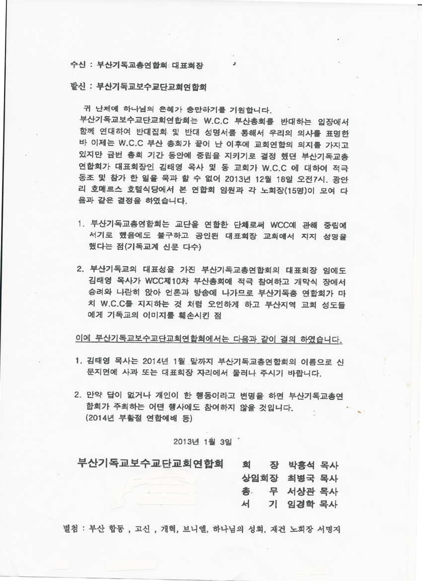 WCC ÈÄÆøÇ³ÀÌ °è¼ÓµÇ°í ÀÖ´Ù. ÇÕµ¿, °í½Å µî º¸¼ö±³´ÜÀÌ °¡ÀԵǾî ÀÖ´Â ºÎ»ê±âµ¶±³º¸¼ö±³´Ü±³È¸¿¬ÇÕȸ(ȸÀå ¹ÚÈï¼® ¸ñ»ç, ÀÌÇÏ º¸¼ö±³´Ü¿¬ÇÕȸ)°¡ Áö³­ 1¿ùÃÊ ºÎ»êÀÇ ´ëÇ¥±â°üÀÎ ºÎ»ê±âµ¶±³ÃÑ¿¬ÇÕȸ(´ëǥȸÀå ±èÅ¿µ ¸ñ»ç)¿¡ °ø¹®À» º¸³» ¡°±Ý¹ø ÃÑȸ ±â°£ µ¿¾È Á߸³À» Áö۱â·Î °áÁ¤Çß´ø ºÎ»ê±âµ¶±³ÃÑ¿¬ÇÕȸ°¡ ´ëǥȸÀåÀÎ ±èÅ¿µ ¸ñ»ç ¹× µ¿ ±³È¸°¡ WCC¿¡ ´ëÇÏ¿© Àû±Ø µ¿Á¶ ¹× Âü°¡ ÇÑ ÀÏÀ» ¹¬°ú ÇÒ ¼ö ¾ø´Ù¡±¸ç ºÎ±âÃÑ ´ëǥȸÀå ±èÅ¿µ ¸ñ»ç°¡ 2014³â 1¿ù ¸»±îÁö ºÎ±âÃÑ À̸§À¸·Î ½Å¹®Áö¸é¿¡ »ç°ú ¶Ç´Â ´ëǥȸÀå ÀÚ¸®¿¡¼­ ¹°·¯³¯ °ÍÀ» ¿ä±¸Çß´Ù. º¸¼ö±³´Ü¿¬ÇÕȸ´Â ÇÕµ¿, °í½Å µî WCC¸¦ ¹Ý´ëÇÏ´Â ³ëȸÀå ¹× ´ëÇ¥ 16¸íÀÇ ¼­¸íÁö¸¦ ÷ºÎÇϸ鼭 ¡°¸¸¾à ´äÀÌ ¾ø°Å³ª °³ÀÎÀÌ ÇÑ ÇൿÀ̶ó°í º¯¸íÀ» ÇÏ¸é ºÎ±âÃÑÀÌ ÁÖÃÖÇÏ´Â ¾î¶² Çà»ç¿¡µµ Âü¿©ÇÏÁö ¾ÊÀ» °Í¡±À̶ó°í ¾Ð·ÂÀ» °¡Çß´Ù.