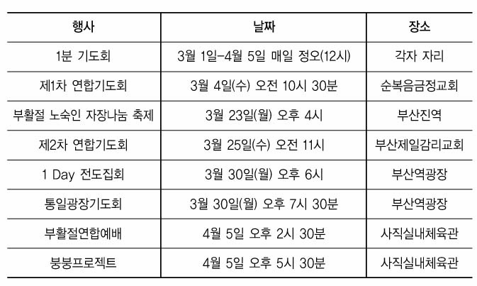 ÁغñÀ§¿øÈ¸(À§¿øÀå À̼º±¸ ¸ñ»ç)´Â 4¿ù 5ÀÏ ºÎȰÀý¿¬ÇÕ¿¹¹è »Ó¸¸ ¾Æ´Ï¶ó 3¿ù 1ÀϺÎÅÍ ºÎȰÀý ¿¬ÇÕ¿¹¹è°¡ ¿¸®´Â 4¿ù 5ÀϱîÁö ¸ÅÀÏ Á¤¿À¿¡ 1ºÐ ±âµµÈ¸¸¦ °³ÃÖÇϰí, 1, 2Â÷ ¿¬Çձ⵵ȸ, ºÎȰÀý ³ë¼÷ÀÎ ÀÚÀ峪´® ÃàÁ¦, 1 Day ÀüµµÁýȸ, ÅëÀϱ¤Àå ±âµµÈ¸, ºØºØÇÁ·ÎÁ§Æ® µî ´Ù¾çÇÑ Çà»ç¸¦ ÁغñÇϰí ÀÖ´Ù.