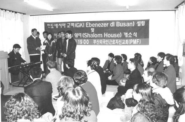 ¡Ý 2003³â 2¿ù 15ÀÏ Åä¿äÀÏ ºÎ»êÁø±¸ ºÎÀüµ¿ ºÎÀü½ÃÀå ³» ÇÑ °Ç¹° 4Ãþ 40¿© ÆòÀÇ °ø°£¿¡ Àεµ³×½Ã¾Æ ±³È¸ ¼³¸³(GKI EBENEZER DI BUSAN)°ú ÀÌÁֳ뵿ÀÚ ½°ÅÍ(SHALOM HOUSE)°¡ ¹®À» ¿­¾ú´Ù. ºÎ»ê¿Ü±¹ÀαٷÎÀÚ¼±±³È¸(Pusan Missionary association for Foreign labor)¿¡¼­ ¹®À» ¿¬ Àεµ³×½Ã¾Æ ±³È¸¿Í ÀÌÁֳ뵿ÀÚ ½°ÅÍ´Â Áö³­ÇØ 12¿ù 14ÀÏ ½°ÅÍ ¸¶·ÃÀ» À§ÇÑ ¶óÀ̺êÄ«Æä¸¦ ÅëÇØ ¾òÀº 500¸¸¿øÀÇ ¼öÀͱݰú ¼±±³È¸ ÈÄ¿ø±ÝÀ¸·Î ¸¶·ÃµÇ¾îÁ³´Ù. Àεµ³×½Ã¾Æ ±³È¸·Î ¿î¿µµÉ 11ÆòÀÇ Å«¹æ°ú ½°ÅÍ·Î ¿î¿µµÉ ÀÛÀº ¹æ 3°³, ½Ä´çµîÀÇ ±¸Á¶¸¦ ÇÑ ÀÌ °Ç¹°Àº ¸Å¿ù ¸¸¸¸Ä¡ ¾Ê´Â ¿î¿µºñ°¡ ÇÊ¿äÇÔ¿¡µµ ½Ã³» Á߽ɺο¡ À§Ä¡ÇØ ¼Ò¿ÜµÇ°í ¾ðÁ¦³ª À̹æÀÎó·³ »ì¾Æ°¡´Â ÀÌÁֳ뵿Àڵ鿡°Ô Âü Çdz­Ã³°¡ µÇ¸®¶ó ±â´ëÇϰí ÀÖ´Ù.