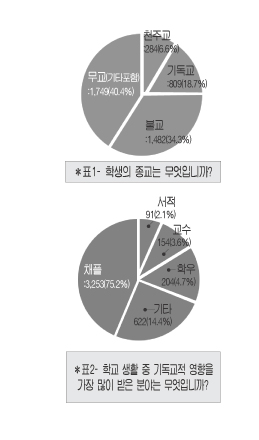 ¶Ç, µ¿¼´ëÇб³¿¡¼´Â ÇлýµéÀÇ Á¾±³¿¡ ´ëÇÑ ¼³¹®Á¶»ç¸¦ ÇÔ²² ½Ç½ÃÇß´Ù. ¸ÕÀú, ÀÚ½ÅÀÇ Á¾±³¸¦ ¹¯´Â Áú¹®¿¡ ÀüüÀÇ 18.7%ÀÎ 809¸íÀÌ ±âµ¶±³, 284¸í(6.6%)ÀÌ ÃµÁÖ±³, 1,482¸í(34.2%)ÀÌ ºÒ±³, °¡Àå ¸¹Àº 1,749¸í(40.4%)ÀÌ ¹«±³¶ó´Â ´äº¯À» ÇØ ºÒ±³¿Í ¹«±³ÀÇ ºñÀ²ÀÌ ³ô°Ô ³ªÅ¸³ ¹Ý¸é ±âµ¶½ÅÀÚÀÇ ºñÀ²ÀÌ ¸¹ÀÌ ³·¾Æ ±âµ¶´ëÇÐÀÇ Æ¯¼ºÀ» ¶ì°í´Â ÀÖÁö¸¸ ±×°ÍÀÌ Çлý °³°³Àο¡°Ô Å©°Ô ¿µÇâÀ» ³¢Ä¡Áö ¸øÇÔÀ» ¾Ë ¼ö ÀÖ¾ú´Ù.