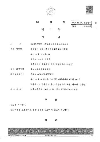 »ç°Ç(2010µÎ20133) ºÎ´çÇØ°í ±¸Á¦ Àç½É ÆÇÁ¤ Ãë¼Ò °Ç¿¡ ´ëÇÑ °í·ÁÇпø ÀÌ»çÀåÀ» »ó´ë·Î ¼Ò¼ÛÀ» Á¦±âÇÑ À±°¼® Àü Àç´Ü»ç¹«±¹ÀåÀº ¿ø½ÉÆÇ°áÀÎ ¼¿ï°íµî¹ý¿ø(2010.8.20ÀÚ)ÀÌ ¡°»ó°í½ÉÀýÂ÷¿¡°üÇÑÆ¯·Ê¹ý Á¦4Á¶¿¡ ÇØ´çÇÏ¿© ÀÌÀ¯ ¾øÀ½ÀÌ ¸í¹éÇϹǷΠÀ§ ¹ý5Á¶¿¡ ÀÇÇÏ¿© »ó°í¸¦ ±â°¢ÇÑ´Ù¡±°í ´ë¹ý°ü(ÀçÆÇÀå ÀÌÈ«ÈÆ, ±è´Éȯ, ÁÖ½É ¹ÎÀÏ¿µ, ÀÌÀκ¹) Àü¿øÀÇ ÀÏÄ¡µÈ ÀǰßÀ¸·Î ÁÖ¹®°ú °°ÀÌ 11¿ù 25ÀÏÀÚ·Î ÆÇ°áÇß´Ù°í ¾Ë·Á¿Ô´Ù.