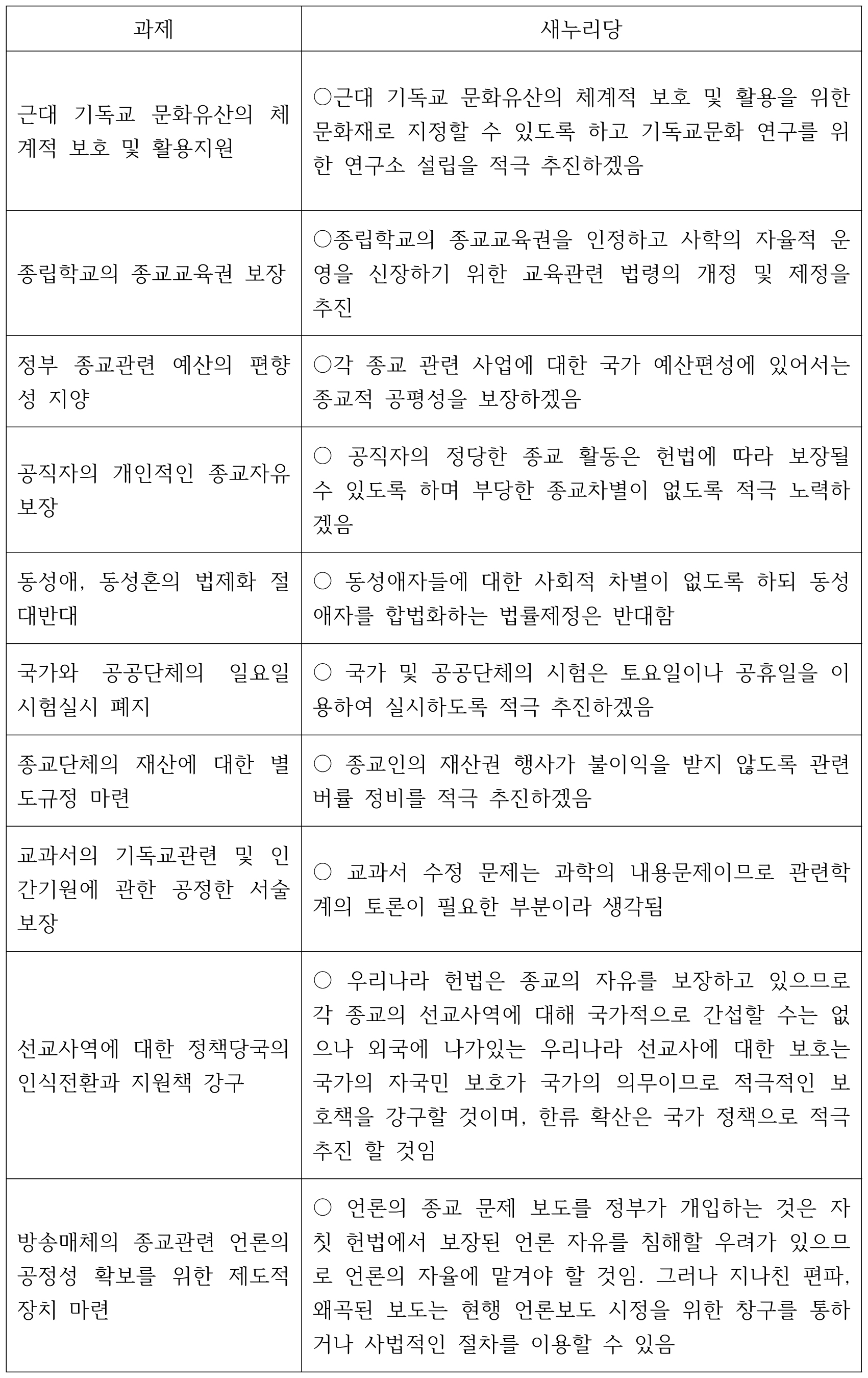 Á¦18´ë ´ë¼±ÀÌ »õ´©¸®´ç ¹Ú±ÙÇý Èĺ¸ÀÇ ´ç¼±À¸·Î ³¡ÀÌ ³µ´Ù. ±×µ¿¾È »õ´©¸®´çÀº Çѱ¹±âµ¶±³°ø°øÁ¤Ã¥ÇùÀÇȸ(ÃÑÀç ±è»ïȯ ¸ñ»ç)¸¦ ÅëÇØ ±âµ¶±³°è¿¡ ´ëÇÑ ´Ù¾çÇÑ Á¤Ã¥µéÀ» Á¦½ÃÇß´Ù. ¶Ç ¼¼ºÎÀûÀÎ ³»¿ë¿¡ ´ëÇØ¼´Â ÇâÈÄ ½ÉµµÀÖ°Ô ´Ù·ê °ÍÀ» ¾à¼ÓÇß´Ù. ƯÈ÷ ¡®±Ù´ë ±âµ¶±³ ¹®È À¯»êÀÇ Ã¼°èÀû º¸È£ ¹× Ȱ¿ëÁö¿ø¡®¿¡ ´ëÇØ¼´Â ±âµ¶±³ ¹®È ¿¬¼ö¸¦ À§ÇÑ ¿¬±¸¼Ò¸¦ ¼³¸³ÇÏ°í ±Ù´ë ±âµ¶±³ ¹®ÈµéÀ» ¹®ÈÀç·Î ÁöÁ¤ÇÒ ¼ö ÀÖµµ·Ï Àû±ØÀûÀÎ ÃßÁøÀ» ¾à¼ÓÇØ ¿Ô´Ù. ¶Ç ÃÖ±Ù À뱂 ½ÇÅÂÁ¶»ç·Î ÀÎÇØ °ÇÇÐÀ̳äÀÌ Å©°Ô ÈѼյǰí ÀÖ´Â ¡®Á¾¸³Çб³ÀÇ Á¾±³±³À°¿ø º¸Àå¡®¿¡ ´ëÇØ¼µµ Á¾¸³Çб³ÀÇ Á¾±³±³À°±ÇÀ» ÀÎÁ¤ÇÏ°í »çÇÐÀÇ ÀÚÀ²Àû ¿î¿µÀ» À§ÇØ ±³À°°ü·Ã ¹ý·ÉÀÇ °³Á¤ ¹× Á¦Á¤À» ÃßÁøÇÒ °ÍÀ» ¾à¼ÓÇß´Ù.