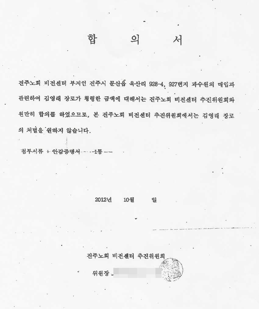ÀçÆÇºÎ¿¡ Á¦ÃâµÈ ÇÕÀǼ´Â ¡®ÁøÁÖ³ëȸ ºñÀü¼¾ÅÍ ÃßÁøÀ§¿øÈ¸ À§¿øÀå ¸ñ»ç K00¡®À̸§À¸·Î ±â·ÏµÇ¾î ÀÖ´Ù. K ¸ñ»ç°¡ ÃßÁøÀ§¿øÈ¸ À§¿øÀå Á÷À» ¸ÃÀº °ÍÀº »ç½ÇÀ̳ª, ÁøÁÖ³ëȸ´Â ±è Àå·Î¿Í ¿ø¸¸ÇÑ ÇÕÀdzª ó¹úÀ» ¿øÇÏÁö ¾Ê´Â´Ù´Â °áÀǸ¦ ÇÑ Àû ¾ø´Ù. ÃßÁøÀ§¿øÀå °³ÀÎÀÌ ÀÓÀÇ·Î ÇÕÀǸ¦ ÇØ ÁØ °ÍÀÌ´Ù. ÇÏÁö¸¸ ÀçÆÇºÎ¿¡´Â ºÐ¸í ¡®ÁøÁÖ³ëȸ ºñÀü¼¾ÅÍ ÃßÁøÀ§¿øÈ¸ À§¿øÀå¡® ¸íÀÇ·Î ÇÕÀǼ°¡ Á¦ÃâµÆ´Ù. ÀçÆÇºÎ ÀÔÀå¿¡¼´Â ´ç»çÀÚµéÀÌ ¿ø¸¸ÇÑ ÇÕÀǸ¦ ÇÑ °ÍÀ¸·Î ÀÎÁ¤ µÉ ¼ö¹Û¿¡ ¾ø´Ù. K ¸ñ»ç ¶ÇÇÑ ÀÌ ¹®Á¦¿Í °ü·ÃÇØ ¾î¶°ÇÑ ÇØ¸íµµ ÇÏÁö ¸øÇϰí ÀÖ´Ù.