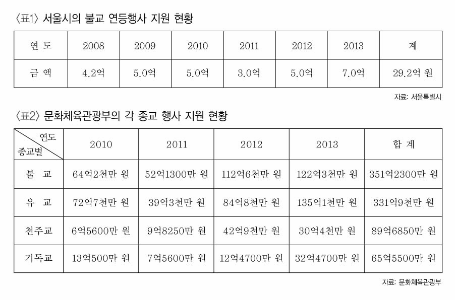 ¸ÕÀú ¼¿ï½Ã°¡ ºÒ±³ÀÇ ¿¬µîÇà»ç¸¦ À§ÇØ Áö¿øÇÑ ±Ý¾×Àº 4³â°£ 20¾ï ¿øÀ̸ç, Ÿ Á¾±³¿¡ ´ëÇÑ ÀçÁ¤ Áö¿øÀº ¾ø´Â °ÍÀ¸·Î ³ªÅ¸³ª°í ÀÖ´Ù. ¼¿ï½Ã´Â ÇØ¸¶´Ù ºÒ±³ÀÇ ¿¬µîÇà»ç¸¦ À§ÇØ Áö¿øÇϰí Àִµ¥, 2009³âºÎÅÍ ÇØ¸¶´Ù Æò±Õ 5¾ï ¿ø¾¿À» Áö¿øÇϰí ÀÖ´Â °ÍÀ¸·Î ³ªÅ¸³ª°í ÀÖ´Ù. (Ç¥1 ÂüÁ¶)