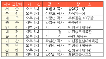 ÇöÀç ¼­¿ïÀº 4¿ù11ÀÏ ¿ÀÈÄ 3½Ã »ó¾Ï°æ±âÀå¿¡¼­ ÀÌ¿ë±Ô ¸ñ»ç(±âµ¶±³´ëÇѼº°á±³È¸ ÃÑȸÀå)ÀÇ »çȸ·Î ¿ÁÇÑÈì ¸ñ»ç(»ç¶ûÀÇ ±³È¸ ¿ø·Î)°¡ ¼³±³¸¦ ¸ÃÀ» ¿¹Á¤À̸ç, ºÎ»êÁö¿ªÀº °°Àº³¯ ¿ÀÈÄ 3½Ã »çÁ÷¾ß±¸Àå¿¡¼­ ¹èÃá½Ä ¸ñ»ç(ºÎ»ê±âµ¶±³ÇùÀÇȸ ´ëǥȸÀå)ÀÇ »çȸ·Î ¼ö¿µ·Î ±³È¸ Á¤Çʵµ ¸ñ»ç°¡ ¼³±³¸¦ ¸Ã´Â´Ù. ÇÏÁö¸¸ ÀÎõ°ú ´ëÀü, ±¤ÁÖµîÀº ¿ÀÈÄ ½Ã°£ÀÌ ¾Æ´Ñ »õº®5½Ã¿¡ ºÎȰÀý¿¬ÇÕ¿¹¹è¸¦ µå¸± ¿¹Á¤ÀÌ´Ù. ±¤ÁÖÁö¿ªÀº ±¤ÁÖ°ø¿ø¿¡¼­ ¹Ú°©¿ë ¸ñ»ç(µÎ¾ÏÁß¾Ó±³È¸)°¡ °­»ç·Î ³ª¼±´Ù.