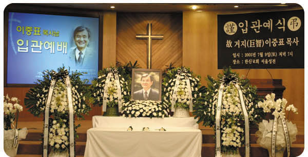 °íÀÎÀÇ Àå·Ê½ÄÀå¿¡¼ ±âÀå ±èµ¿¿ø ÃÑȸÀåÀº ¡°ÀÌÁßÇ¥ ¸ñ»ç´Â º°¼¼ÇßÁö¸¸, ±×ÀÇ ¶¡°ú ´«¹°ÀÌ ¹è¾î ÀÖ´Â Çѽű³È¸, ±×°¡ Çå±ÝÀ» ¶¼¾î¼ µµ¿ÍÁØ ¸¹Àº °³Ã´±³È¸, º°¼¼½ÅÇÐÀ» ÀüÇÑ º°¼¼¸ñȸ¿¬±¸¿ø°ú ¸¹Àº Àú¼ µîÀ» ÅëÇØ ±×ÀÇ ½ÅÇаú Á¤½ÅÀº ¿ì¸®¿¡°Ô ³²¾Æ ÀÖ´Ù¡°¸ç ¡°°íÀÎÀº Çѱ¹ ±³È¸ÀÇ À§´ëÇÑ ÁöµµÀÚ¿´°í ±âÀåÀÇ ÀÚ¶ûÀ̾ú´Ù¡°°í ÀüÇß´Ù. ±èµ¿¿ø ÃÑȸÀåÀÇ ¸»Ã³·³ °íÀÎÀÇ À°½ÅÀº »ç¶óÁ³Áö¸¸ °íÀÎÀÇ ½ÅÇаú Á¤½ÅÀº ¿µ¿øÈ÷ ¿ì¸®¿¡°Ô ±â¾ïµÉ °ÍÀÌ´Ù.
