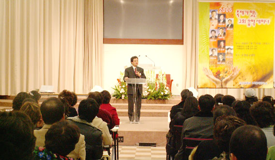 ÀÌ¾î ±è¼º¼ö °í½Å´ë ÃÑÀåÀº ¡®±³È¸À½¾Ç ÁöµµÀÚÀÇ ¸®´õ½±¡¯À̶ó´Â ÁÖÁ¦ÀÇ °ÀÇ¿¡¼ ¡°Çϳª´ÔÀº ±³È¸¶ó´Â °øµ¿Ã¼¸¦ °¡Àå »ç¶ûÇϱ⿡ ±³È¸ÁöµµÀÚµéÀÌ Àü¹®¼ºÀ» °®Ãç ±³È¸À½¾Ç¼¼¹Ì³ª¸¦ ¹è¿ö¾ßÇÑ´Ù¡±¸ç ÀÚ¸®¿¡ ÇÔ²²ÇÑ »ç¶÷µéÀ» °Ý·ÁÇß´Ù. ¶Ç, ¡°À½¾ÇÀÌ ¾ø´Â ¿¹¹è´Â »ý°¢ÇÒ ¼ö ¾ø´Ù¡±¸ç ¡°À½¾ÇÀÌ ¾øÀ¸¸é ¿µ»ý, Èû, ±â»ÝÀ» ´©¸±¼ö ¾ø´Ù¡±°í À½¾Ç¿¡ ´ëÇÑ Á߿伺À» °Á¶Çß´Ù. ¼Â°½Ã°£¿¡ Á¶¼ºÈ¯ ±³¼ö´Â ¡®Âù¾ç´ëÀÇ ¿µ¼º°ú À½¾Ç¼º¡¯À̶ó´Â ÁÖÁ¦·Î °ÀǸ¦ ÁøÇàÇÏ¸é¼ ¡°Çϳª´Ô²² Âù¾çÀ¸·Î ¿µ±¤À» µ¹¸®´Â Âù¾ç´ë´Â ¹«¾ùº¸´Ù Áß¿äÇÏ´Ù¡±¸ç ¡°Âù¾ç´ë°¡ ¿µ¼ºÀ» ¸ÕÀú °®Ãß°í À½¾Ç¼ºÀ» Ű¿ö°¥ °Í¡±À» °Á¶Çß´Ù.