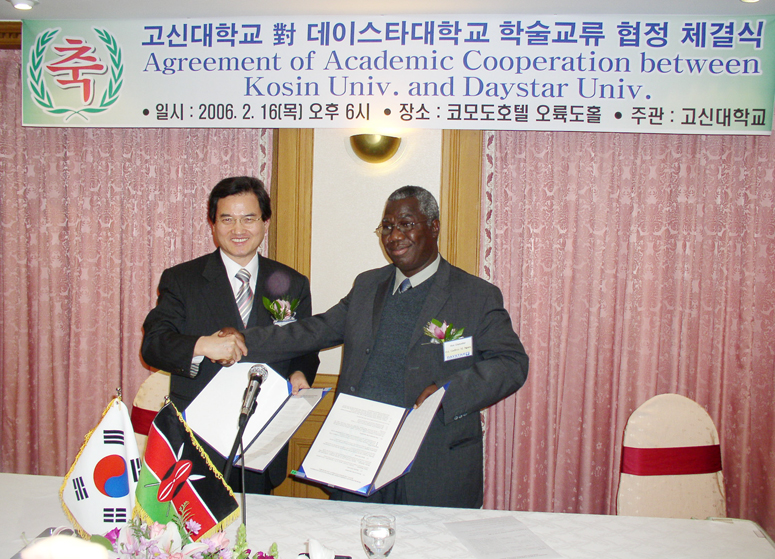 °í½Å´ëÇб³ À½¾Ç´ç¿¡¼­ ¸í¿¹±³À°ÇÐ ¹Ú»çÇÐÀ§¸¦ ¹ÞÀº ÄɳÄDaystar ´ëÇÐ Godfrey Mbiti Ngure ÃÑÀå°ú °í½Å´ëÇб³ ±è¼º¼ö ÃÑÀåÀº Áö³­ 16ÀÏ Äڸ𵵠ȣÅÚ¿¡¼­ ¾ç±³°£ Çмú±³·ù ÇùÁ¤ ü°á½ÄÀ» °¡Á³´Ù. ¡°Daystar ´ëÇÐÀº 1964³â¿¡ Áü¹Ùºê¿¡¼­ ½ÃÀÛµÈ Çб³·Î ÇöÀç 2500¿©¸íÀÇ ÇлýµéÀÌ ÀÖÀ¸¸ç, ¾ÆÇÁ¸®Ä« 40¿©°³±¹ÀÇ ÀÎÀçµéÀ» ¼ö¿ëÇϰí ÀÖ´Ù¡±°í »çȸ¸¦ ¸ÃÀº ¹Ú½ÅÇö ±³¼öÀÇ ¼Ò°³·Î Çà»ç°¡ ÁøÇàµÇ¾ú´Ù.
