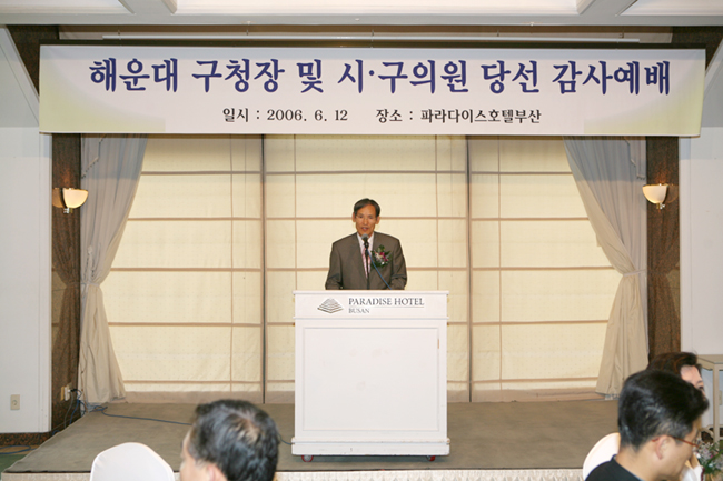 Áö³­ 12ÀÏ(¿ù) ¾ÆÄ§ 7½Ã ÇØ¿î´ë ÆÄ¶ó´ÙÀ̽º È£ÅÚ¿¡¼­´Â ÇØ¿î´ë±¸ ±¸Ã»Àå ¹× ½Ã¡¤±¸ÀÇ¿ø ´ç¼±ÀÚµéÀ» À§ÇÑ Á¶Âù¿¹¹è¸¦ ÇØ¿î´ë ±³È¸¿Í ±¸Á¤ ÇùÀÇȸÀÇ ÁÖÃÖ·Î ¿­·È´Ù. Á¤°æÃ¶ ¸ñ»ç(ÇØ¿î´ë ¸ÅÀϼøº¹À½±³È¸)ÀÇ »çȸ·Î ½ÃÀÛµÈ ¿¹¹è¿¡´Â À̸¥ ¾ÆÄ§ÀÓ¿¡µµ ºÒ±¸ÇÏ°í ´ç¼±ÀÚµé(22¸í)À» ºñ·ÔÇÏ¿© 100¿©¸íÀÌ Âü¼®ÇÏ¿© ¿¹¹è¿Í ÃàÇÏÀÇ ÀÚ¸®¸¦ °¡Á³´Ù.