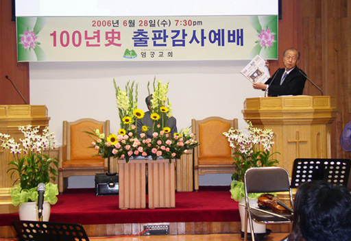 À̳¯ ±è¼ºÃµ ¸ñ»ç´Â ¡°¾ö±Ã±³È¸´Â Çѱ¹ÀÇ ¿ª»ç¿Í ÇÔ²²Çؿ ±³È¸¡±¶ó°í ¼Ò°³Çϸ鼭 ¡°ÀÏÁ¦¸»¿¡ ½Å»çÂü¹è ¹Ý´ë ÀÌÀ¯·Î ±³È¸°¡ Æó¼â ´çÇØ ÇØ¹æ ÈÄ¿¡ ±³È¸¹®À» ´Ù½Ã ¿­°Ô µÇ¾ú´Ù. 2004³âÀÌ 100ÁÖ³âÀε¥, ¼³¸³ÀÚ ¼ÕÀںв²¼­ ¿¬·ÎÇØ º°¼¼Çϼż­ ÀÚ·á°¡ ºÎÁ·ÇØ ¿À´Ã¿¡¼­¾ß È­º¸¸¦ ÃâÆÇÇÏ°Ô µÇ¾ú´Ù. »õ·Î¿î 100³âÀÇ ¿ª»ç¸¦ ³²±â°Ô µÇ¾î Èå¹µÇÏ°Ô »ý°¢Çϰí, Çѱ¹±³È¸ÀÇ ¹ßÀüÀ» µ¹¾Æº¸¸é¼­ °í¹«ÀûÀÎ »ý°¢À» °¡Áø´Ù¡±°í ¼Ò°¨À» ÀüÇß´Ù.