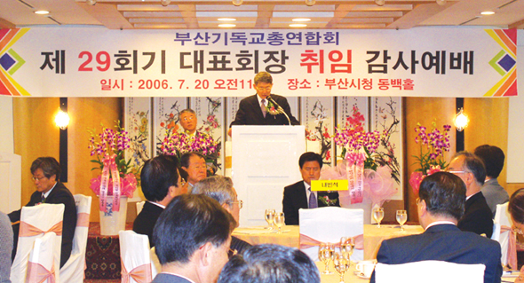 ºÎ»ê±âµ¶±³ÃÑ¿¬ÇÕȸ(´ëǥȸÀå Á¤°æÃ¶ ¸ñ»ç) Á¦29ȸ±â ´ëǥȸÀå ÃëÀÓ½ÄÀÌ Áö³­ 7¿ù20ÀÏ ºÎ»ê½Ãû µ¿¹éȦ¿¡¼­ ¿­·È´Ù.