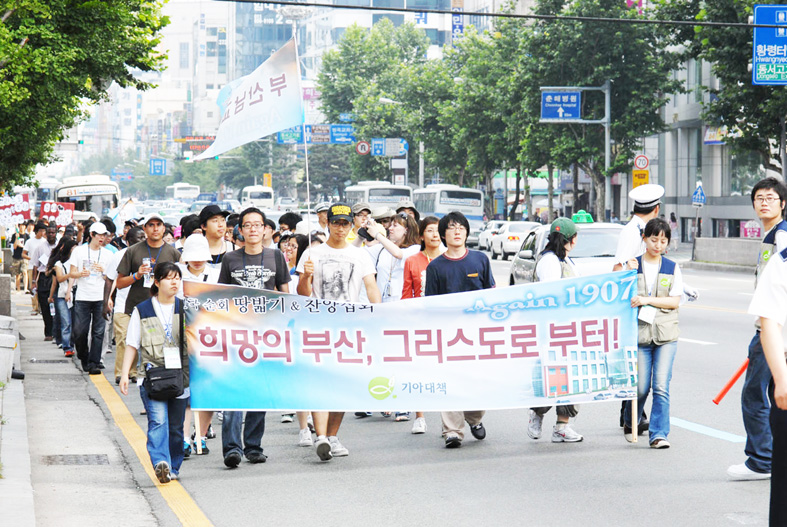1907 Æò¾ç ´ëºÎÈïÀÇ Á¤½ÅÀ» À̾î¹Þ¾Æ 2007³â, ºÎ»êÀ» ³Ñ¾î Çѱ¹°ú Æò¾ç¿¡±îÁö ºÎÈïÀÇ ºÒ±æÀ» À̾ÀÚ´Â ÀǹÌÀÇ ±¹Åä¼ø·Ê Âù¾çÁýȸ°¡ À̾îÁö°í ÀÖ´Ù. 7¿ù 7ÀÏ(Åä) ±â¾Æ´ëÃ¥ ºÎ»êÁö¿ªº»ºÎ´Â 100³â Àü Æò¾ç¿¡ ºÒ¾ú´ø ¼º·ÉÀÇ ºÒ±æÀ» ºÎ»ê ¶¥¿¡¼ ¡®È¸°è, ±âµµ, ±× ´ÙÀ½Àº ³ª´®¡¯ÀÇ ÁÖÁ¦ ¾Æ·¡ ºÎ»êÀÇ ±âµ¶Ã»³â°ú ÇÔ²² ¶¥ ¹â±â¿Í Âù¾çÁýȸ¸¦ ¿¾ú´Ù. 4½ÃºÎÅÍ ½ÃÀÛµÈ ¶¥ ¹â±â Çà»ç´Â ¿Ü±¹¿¡¼ ¿Â ÇлýµéÀ» Æ÷ÇÔ ¾à 200¿©¸íÀÇ Ã»³âµéÀÌ Âü°¡ÇÏ¿©, ÀÌ ¶¥ÀÇ ºÎÈïÀ» ¿°¿øÇÏ¸ç ¼¸é¿¡¼ ¿¬»êµ¿±îÁö ºÎ»êÀÇ Áß½ÉÁö 7km ¼ø·Ê¸¦ ÅëÇØ ȸ°è¿Í ¼º½Ãȸ¦ À§ÇØ ±âµµÇß´Ù. ÀÌÈÄ ºÎ»ê³²±³È¸¿¡¼´Â 7½ÃºÎÅÍ ¿Ë±âÀåÀÌ¿Í ÇÔ²²ÇÑ Âù¾ç°ú ȸ°èÀÇ ½Ã°£, ºÎ»ê¼º½ÃȺ»ºÎ À¯ÀÓ±Ù ¸ñ»çÀÇ ¸»¾¸À» ÅëÇØ ÁøÁ¤À¸·Î ȸ°èÇÏ´Â ¸¶À½°ú ¶ß°Å¿î ±âµµ·Î Çϳª µÇ´Â ½Ã°£À» °¡Á³´Ù. À̳¯ ÇÔ²²ÇÑ Ã»³âµéÀº ±â¾Æ´ëÃ¥ÀÌ ÇØ¿À°í ÀÖ´Â ¡®Æò¾ç¶ô¶û¼¶±èÀικ´¿ø¡¯ °Ç¼³À» À§ÇÑ ¡®º®µ¹ ÇÑ À塯 ±â±Ý ¸¶·ÃÀ» ÅëÇØ ³ª´®ÀÇ ½Çõ¿¡ µ¿ÂüÇϱ⵵ Çß´Ù. À̹ø ±¹Åä¼ø·Ê Âù¾çÁýȸ´Â 3ÀÏ ºÎ»ê ±âÀ屺¿¡¼ Ãâ¹ßÇÏ¿© Àü±¹ 18°³ Áö¿ª¿¡¼ ¿¸®°í ÀÖÀ¸¸ç, Çdz¯·¹´Â 21ÀÏ ¼¿ï ¹Ì¾Æµ¿ °ºÏÁ¦Àϱ³È¸¿¡¼ Àå½ÄÇÑ´Ù. Âù¾çÁýȸ¿¡ Âü¿©ÇÏ´Â ¾ÆÆ¼½ºÆ®´Â ÄÁƼ³ÙÅ»½Ì¾îÁî(±âÀå, ¾ç»ê, ÀÍ»ê), ¿Ë±âÀåÀÌ(ºÎ»ê, ´ëÀü, ±ºÆ÷), Ç츮ƼÁö(±¤ÁÖ, ¿ï»ê), Æ®¸®´ÏƼ ÄܼƮ(¼¿ï) µîÀÌ´Ù.