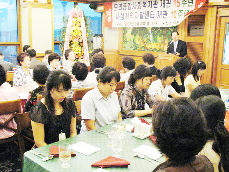 Áö¿ªÀÇ ¼Ò¿ÜµÈ ÀÌ¿ô¿¡°Ô ±×¸®½ºµµÀÇ »ç¶ûÀ» ÀüÇØ¿Â û½ÊÀÚ»çȸº¹Áöȸ ¸ð¶óÁ¾ÇÕ»çȸº¹Áö°ü, »ç»óÁö¿ªÀÚȰ¼¾ÅͰ¡ °¢°¢ °³°ü 15ÁÖ³â, °³¼Ò 10ÁÖ³âÀ» ¸Â¾Ò´Ù. À̸¦ ±â³äÇØ Áö³ 3ÀÏ, ºßÆäÆÄÅ©¿¡¼´Â Á÷¿øµéÀ» °Ý·ÁÇϰí, ÃàÇÏÇÏ´Â ±â³ä½ÄÀÌ Á÷¿ø ¹× ³»ºó 70¿©¸íÀÌ Âü¼®ÇÑ °¡¿îµ¥ ¿·È´Ù. 1ºÎ ¿¹¹è¿¡¼´Â ¹®¿µµµ ¸ñ»ç(»êÁ¤Çö±³È¸)°¡ °ñ·Î»õ¼ 3:15~17·Î ÀüÇÑ ¸»¾¸À» ÅëÇØ ¡°¿À´Ã ÀÌ ½Ã°£À» ÅëÇØ ¼ö°íÇÑ ÀÚ¸¦ ³ôÀ̰í, ¶Ç Áö±Ý±îÁö º¹Áö°ü°ú Áö¿ªÀÚȰ¼¾Å͸¦ ÀÖ°Ô ÇØ ÁֽŠÇϳª´Ô°ú º¸ÀÌÁö ¾Ê°Ô µµ¿ÍÁØ ºÐµé¿¡°Ô °¨»çÇÏ´Â ½Ã°£ÀÌ µÇÀÚ¡±°í ÀüÇß´Ù. À̾îÁø ±â³ä½Ä¿¡´Â ¹Ú¿µ±Ô °üÀåÀÌ ±â³ä»ç¸¦, ¾ç´öÈ£ ´ëÇ¥À̻簡 °Ý·Á»ç¸¦ ÅëÇØ ¡°Ã»½ÊÀÚ Á¤½ÅÀ» À̾î¹Þ¾Æ »ç¶ûÀ» ½Çõ ÇÏ´Â º¹Áö°üÀÌ µÉ °Í¡±À» ´çºÎÇßÀ¸¸ç, ½ÅÀÌ°Ç Àå·Î(Çѱ¹±âµ¶½Å¹®»ç »çÀå)°¡ Ãà»çÇß´Ù. ¶Ç, 10³â ±Ù¼ÓÇÑ 2¸íÀÇ Á÷¿ø¿¡°Ô ǥâÇϰí, º¹Áö°ü°ú ÀÚȰ¼¾ÅͰ¡ ÇÑ ÇØ µ¿¾È ÇØ ¿Â »ç¾÷À» µÇµ¹¾Æº¸´Â µî ÀÇ¹Ì ÀÖ´Â ½Ã°£À» °¡Á³´Ù. »çȸº¹Áö¹ýÀΠû½ÊÀÚ»çȸº¹Áöȸ´Â 1976³â °í Àå±â·Á ¹Ú»ç°¡ ¼³¸³ÇßÀ¸¸ç, ¼±ÇÑ »ç¸¶¸®¾ÆÀÎÀÇ »îÀ» »ì¾Æ¿Â °í Àå±â·Á ¹Ú»çÀÇ ¶æÀ» ÀÌ¾î ¹Þ¾Æ ÂüµÈ ÀÌ¿ô »ç¶ûÀ» ½ÇõÇϰí ÀÖ´Ù.