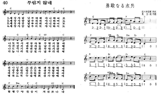 ÀÏÁ¦ ±º°¡³ª â°¡ÀÇ °îÀ» ±×´ë·Î µû¿Â ÀϺΠº¹À½¼º°¡°¡ ±³È¸¿¡¼­ ¿©ÀüÈ÷ »ç¿ëµÇ°í ÀÖ´Ù´Â °ÍÀ¸·Î ¹àÇôÁ³´Ù. ¹®Á¦ÀÇ °îÀº 1979³â 11¿ù 30ÀÏ ÃÊÆÇÀÌ ³ª¿Â µÚ 81³â±îÁö È®ÀÎµÈ °Í¸¸ 20ÆÇÀ» Âï¾î³½ ºÎÈïȸ¿ë º¹À½¼º°¡(¿µ»êÃâÆÇ»ç) 5Àå, 1997³â ¹ßÇàµÈ »õ·Î¿î º¹À½¼º°¡(»õ·Î¿îÃâÆÇ»ç) 40Àå¿¡ ½Ç¸° ¡®¼¼»ó»ç¶÷ ³¯ ºÎ·¯¿ö ¾Æ´ÏÇÏ¿©µµ~¡¯·Î ½ÃÀ۵Ǵ ¡®ºÎ·´Áö ¾Ê³×¡¯¶ó´Â °î°ú ¡®Ã¢¼¼±â, Ãâ¾Ö±Á±â, ·¹À§±â~¡¯·Î ½ÃÀ۵Ǵ ºÎÈïȸ¿ë º¹À½¼º°¡ 35Àå¿¡ ÀÖ´Â ¡®¼º°æ¸ñ·Ï°¡¡¯ µîÀÌ´Ù. ¡®ºÎ·´Áö ¾Ê³×¡¯¶ó´Â °îÀº ¡®¿ë°¨ÇÑ ¼öº´¡¯À̶ó´Â ÀÏÁ¦ ±º°¡¿¡¼­ µû¿Â ³ë·¡·Î, ¡®¿ë°¨ÇÑ ¼öº´¡¯Àº ûÀÏÀüÀïÀÇ ½Â¸®¸¦ Âù¾çÇÏ°í ¾Ö±¹½ÉÀ» °íÃë½ÃŰ´Â ÀϺ»ÀÇ ±¹¹Î°¡¿ä¶ó°í ÇÑ´Ù. ¶Ç, ¼º°æÀÇ ¸ñ·ÏÀ» ³ë·¡·Î ½±°Ô ¿Ü¿ï ¼ö ÀÖµµ·Ï ¸¸µé¾îÁø ¡®¼º°æ¸ñ·Ï°¡¡¯´Â ÀÏÁ¦°¡ µµÄì ½Å¹Ù½Ã¿¡¼­ ¿äÄÚÇϸ¶ ÂÊÀ¸·Î öµµ¸¦ ³õ¾Æ °³ÅëÇßÀ» ¶§ Áö¾î ºÎ¸¥ 4Çà 66Àý ³ë·¡ ¡®Ã¶µµÃ¢°¡-µµÄ«À̵µÆí¡¯¿¡¼­ °îÀ» µû¿Â °ÍÀÌ´Ù. . ÀÌ·¯ÇÑ »ç½ÇÀº ¡®°è¼ºÁ¾ÀÌ ¿ª»ç¹ß¹°°ü¡¯ Á¶Çü±Õ °üÀåÀÌ Á÷Á¢ ÀϺ»¿¡ °¡¼­ ¾Çº¸¸¦ äÁýÇØ ¿À´Â µî ¼ö³â°£ÀÇ ³ë·Â ³¡¿¡ ¹àÇô³½ °ÍÀÌ´Ù. È®ÀÎÀ» À§ÇØ Á÷Á¢ µÎ ³ë·¡ÀÇ ¾Çº¸¸¦ ºñ±³Çϰí, µé¾îº» °á°ú ¡®ºÎ·´Áö ¾Ê³×¡¯¿Í ÀÏÁ¦ ±º°¡ ¡®¿ë°¨ÇÑ ¼öº´¡¯Àº °¢ À½ÀýÀÇ ¹ÚÀÚ¸¸ ´Þ¶óÁ³À» »Ó °îÁ¶´Â °°¾Ò´Ù. ¡®¼º°æ¸ñ·Ï°¡¡¯¿Í ¡®Ã¶µµÃ¢°¡¡¯´Â °îÁ¶¿Í ¹ÚÀÚ°¡ ¸ðµÎ À¯»çÇß´Ù. ±×µ¿¾È ÀÏÁ¦ ±º°¡³ª â°¡ÀÇ °îÁ¶¸¦ µý µ¿¿ä³ª °¡¿ä µîÀÌ ÀÖ´Ù´Â »ç½ÇÀº ¾Ë°í ÀÖ¾úÁö¸¸, Áö±Ý±îÁö Çϳª´ÔÀ» Âù¾çÇÏ´Â °î¿¡ ÀÏÁ¦ÀÇ ÀÜÀç°¡ ³²¾Æ ÀÖ´Ù´Â »ç½ÇÀº ¾ËÁö ¸øÇÑ Ã¤ Áö±Ý±îÁö »ç¿ëÇØ ¿Ô´Ù.