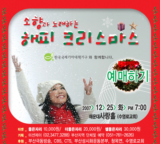 Áö³­ 25ÀÏ Àú³á 7½Ã, ºÎ»ê±Øµ¿¹æ¼Û, CBS, CTS, ºÎ»ê¼º½ÃÈ­¿îµ¿º»ºÎ µîÀÌ ÈÄ¿øÇÏ´Â ¡®¼ÒÇâ°ú ÇÔ²²ÇÏ´Â ÇØÇÇÅ©¸®½º¸¶½º¡¯°¡ ÇØ¿î´ë¼ö¿µ·Î±³È¸(ÇØ¿î´ë»ç¶ûȦ)¿¡¼­ ¿­·È´Ù. ¼ºÅºÀÇ ²ÞÀ» ³ë·¡ÇÏ´Â Å©¸®½º¸¶½º ¼±¹°°úµµ °°Àº ½Ã°£À» ¼±»çÇÑ ¡®¼ÒÇâ°ú ³ë·¡ÇÏ´Â ÇØÇÇÅ©¸®½º¸¶½º¡¯´Â 1ºÎ ²Þ, 2ºÎ ¼±¹°À» ÁÖÁ¦·Î ÁøÇàµÇ¾úÀ¸¸ç, ¿ì¸®¿¡°Ô Ä£¼÷ÇÑ Å©¸®½º¸¶½º ij·Ñ°ú ÇÔ²² Äܼ­Æ®ÀÇ ÈïÀ» ÇÑÃþ ºÏµ¸¾Ò´Ù. °ø¿¬À» ÅëÇØ ¾ò¾îÁö´Â ¸ðµç ¼öÀͱݰú ±âºÎ±Ý Àü¾×Àº ºÎ»êÁö¿ª °ÅÁÖÀÚ Áß ¿¹´É°è¿­´ëÇп¡ ÁøÇÐÇÏ¿© ¹Ì·¡ÀÇ ¿¹¼ú°¡·Î¼­ÀÇ ²ÞÀ» Ű¿ì´Â ¾î·Á¿î ȯ°æÀÇ ¼Ò³â¼Ò³à°¡ÀåµéÀÇ ´ëÇÐÀÔÇеî·Ï Áö¿ø±ÝÀ¸·Î ¾²¿©Áú ¿¹Á¤ÀÌ´Ù. (ƼÄÏ: ÁÁÀºÀÚ¸® 10000¿ø ´õÁÁÀºÀÚ¸® 20000¿ø Á©ÁÁÀºÀÚ¸® 30000¿ø