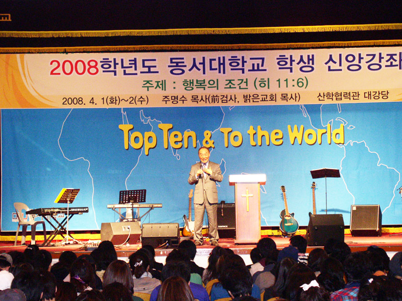 µ¿¼´ëÇб³(ÃÑÀå ¹Úµ¿¼ø)´Â Áö³ 4¿ù 1ÀÏ~2ÀÏ ¾çÀϰ£ »êÇÐÇù·Â°ü ´ë°´ç¿¡¼ ¡®2008³â Çлý½Å¾Ó°Á¡¯¸¦ °®°í ÇлýµéÀÇ ±âµ¶±³Àû ºñÀü°ú °¡Ä¡°üÀ» Á¦½ÃÇß´Ù. ±âµ¶±³Á¤½ÅÀÇ ÂüµÈ »ç¶û°ú ±× ³ª´®ÀÇ °ÇÇÐÀ̳äÀ» µÇ»õ°Ü Ä·ÆÛ½º º¹À½È¸¦ ½ÇÇöÇϱâ À§ÇÑ Çлý½Å¾Ó°Á´ µ¿¼´ë°¡ ¸Å³â º½¿¡ ½Ç½ÃÇÏ´Â ¼¼¹Ì³ª·Î¼ ¿ÃÇØ´Â ¡®ÇູÀÇ Á¶°Ç¡¯À̶ó´Â ÁÖÁ¦·Î YFCÀÌ»çÀå ÁÖ¸í¼ö ¸ñ»ç(¹àÀº±³È¸)¸¦ °»ç·Î ÃÊû, °³ÃֵƴÙ. ÁÖ ¸ñ»ç´Â ¡°¸ðµç Çй®Àº Çϳª´ÔÀÇ Çʿ信 ÀÇÇØ Áö¾îÁ³´Ù. ÀÌ¿¡ ³¯¸¶´Ù ±ú¾î »õ·Î¿î ¿µ¼ºÀ» °®Ãß°í Áö½ÄÀ» ¹Þ¾Æµé¿©¾ß Çϸç, »îÀÇ ÇöÀåÀÇ º¹À½ÀüÆÄ¸¦ À§ÇØ ±× ºÐ¾ß¿¡¼ °íµµÀÇ Àü¹®°¡·Î °Åµì³ª¾ß ÇÑ´Ù¡±¸ç Àü¹®Áö½ÄÀÎÀÇ ¿ªÇÒÀ» °Á¶ÇÑ µ¥ ÀÌ¾î ¡°ÂüµÈ Àμº°ú ¹Ù¸¥ ½Å¾ÓÀ» ¹ÙÅÁÀ¸·Î ¹è¿ì´Â ¸ðµç Áö½ÄÀ» ¿ÀÁ÷ Çϳª´ÔÀÇ ¿µ±¤À» À§ÇØ »ç¿ëÇØ¾ß ÇÑ´Ù¡±¸ç ±âµ¶±³Àû °¡Ä¡°üÀ» È£¼ÒÇß´Ù. µ¿¼´ë À¯Àǽб³¸ñ½ÇÀåÀº ¡°Çлý°Á¸¦ ÅëÇØ ¸ðµç ÇлýµéÀÌ »ý¸íÀÇ ¸»¾¸À» ¹ÙÅÁÀ¸·Î ÇÑ ÇູÇÑ »î, ÇູÇÑ ¼¼»óÀÇ ¹®Áö±â·Î °Åµì³ª±æ ¼Ò¸ÁÇÑ´Ù¡±¸ç Çлý½Å¾Ó°ÁÂÀÇ ÃëÁö¸¦ ¹àÇû´Ù.