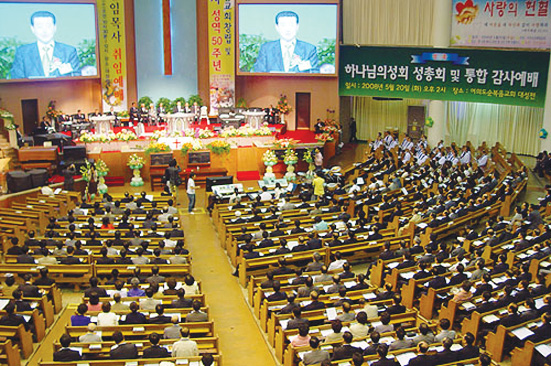 Çϳª´ÔÀÇ ¼ºÈ¸ ÅëÇÕÃøÀº 19ÀÏ ÀÌõ¼øº¹À½±³È¸ ´ë¼ºÀü¿¡¼ µ¶ÀÚÀûÀ¸·Î ÃÑȸ¸¦ °³ÃÖÇÏ¸é¼ ´ÙÀ½³¯(20ÀÏ) ÅëÇÕÃÑȸ¿¡ Âü¼®¿©ºÎ¸¦ ³õ°í ³í¶õÀ» °ÅµìÇß´Ù. Âü¼®ÀÚµéÀº ¡°3000±³È¸ÀÎ (Çϳª´ÔÀÇ ¼ºÈ¸)ÅëÇÕÃøÀÌ 200¿© ±³È¸ÀÎ ¿¹Çϼº¿¡°Ô ²ø·Áµé¾î°¥ ÀÌÀ¯°¡ ¾øÁö ¾Ê´À³Ä¡±¸ç Ưº°¹ý¿¡ ¼öÁ¤À» ¿ä±¸Çß´Ù. ¹Ý¸é ¿©ÀǵµÆÄ Áß½ÉÀ¸·Î´Â ¡°Æ¯º°¹ýÀº ÇѽÃÀûÀÎ ¹ýÀÌ¸ç ¼¼±³´ÜÀÇ ÅëÇÕÃßÁøÀ§¿øÈ¸°¡ ÇÕÀÇÇÏ°í ±³´Ü ÃÑȸÀåµµ ÀÎÁ¤ÇÑ ¹ý¡±À̶ó¸ç Á¶¿ë¸ñ ¸ñ»ç¸¦ ¹Ï°í ÇϳªµÈ Çϳª´ÔÀÇ ¼ºÈ¸¸¦ ÀÌ·çÀÚ°í ÁÖÀåÇß´Ù.