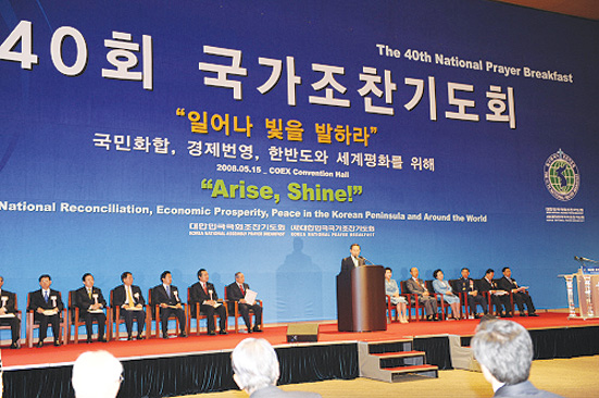 Á¦40ȸ ±¹°¡Á¶Âù±âµµÈ¸°¡ Áö³ 15ÀÏ ¿ÀÀü 7½Ã ¼¿ï ÄÚ¿¢½º ÄÁº¥¼ÇȦ¿¡¼ À̸í¹Ú ´ëÅë·É ³»¿Ü¸¦ ºñ·ÔÇÑ ±¹³»¿Ü 3500¿©¸íÀÌ Âü¼®ÇÑ °¡¿îµ¥ ¡®ÀϾ ºûÀ» ¹ßÇ϶󡯶ó´Â ÁÖÁ¦·Î °³ÃֵƴÙ.