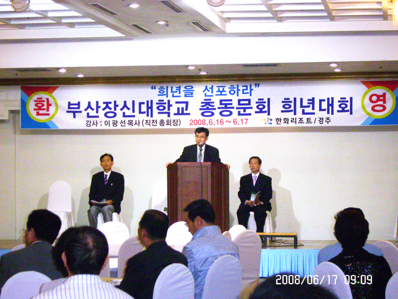 ºÎ»êÀå½Å´ëÇб³ Ãѵ¿¹®È¸(ȸÀå ÀåÇö¿î ¸ñ»ç)°¡ ¡®Èñ³âÀ» ¼±Æ÷ÇÏ¶ó¡¯ ÁÖÁ¦ ¾Æ·¡ Áö³ 6¿ù 16ÀÏ ¿ÀÈÄ 2½ÃºÎÅÍ 17ÀÏ ¿ÀÀü 9½Ã 30ºÐ±îÁö °æÁÖº¸¹®°ü±¤´ÜÁö ÇÑȸ®Á¶Æ® ¿¡Åæ°ü¿¡¼ ¡®Á¦50ȸ Ãѵ¿¹® Èñ³â´ëȸ¡¯¸¦ °³ÃÖÇß´Ù. Ãѵ¿¹®È¸ ȸÀå ÀåÇö¿î ¸ñ»ç´Â Àλ縻À» ÅëÇØ ¡°±Ý³âÀº Ãѵ¿¹®¿ª»ç»ó 50³â¿¡ Çѹø ¸Â´Â Èñ³âÀÇ Æ¯º°ÇÑ ÀÚ¸®´Ù¡±¸ç ¡°ÇÐâ½ÃÀýÀ» Ãß¾ïÇÏ¸ç ¶ß°Å¿î ¸ð¼º¾Ö¿Í °°Àº ½Ã°£À» º¸³»´Þ¶ó¡±°í ÀüÇß´Ù. À̳¯ Ư°½Ã°£¿¡´Â À̱¤¼± ¸ñ»ç(Á÷ÀüÃÑȸÀå, ½ÅÀϱ³È¸)°¡ ÁÖ°»ç·Î ³ª¼ ¸»¾¸À» ÀüÇß´Ù. À̾î Á¦ 49ȸ Á¤±â ÃÑȸ¿¡¼ Á¤ºÀ±â ¸ñ»ç(³²¼¿ï¼¼Àº±³È¸)¿Í ÃÖ¼º±¤ ¸ñ»ç(ÁÖ´ÔÀDZ³È¸)°¡ ¼ö¼®ºÎȸÀå È帷Π¿Ã¶ó Á¤ºÀ±â ¸ñ»ç°¡ ´ç¼±µÇ¾ú´Ù. ÀÌ»ó¹Î ±âÀÚ