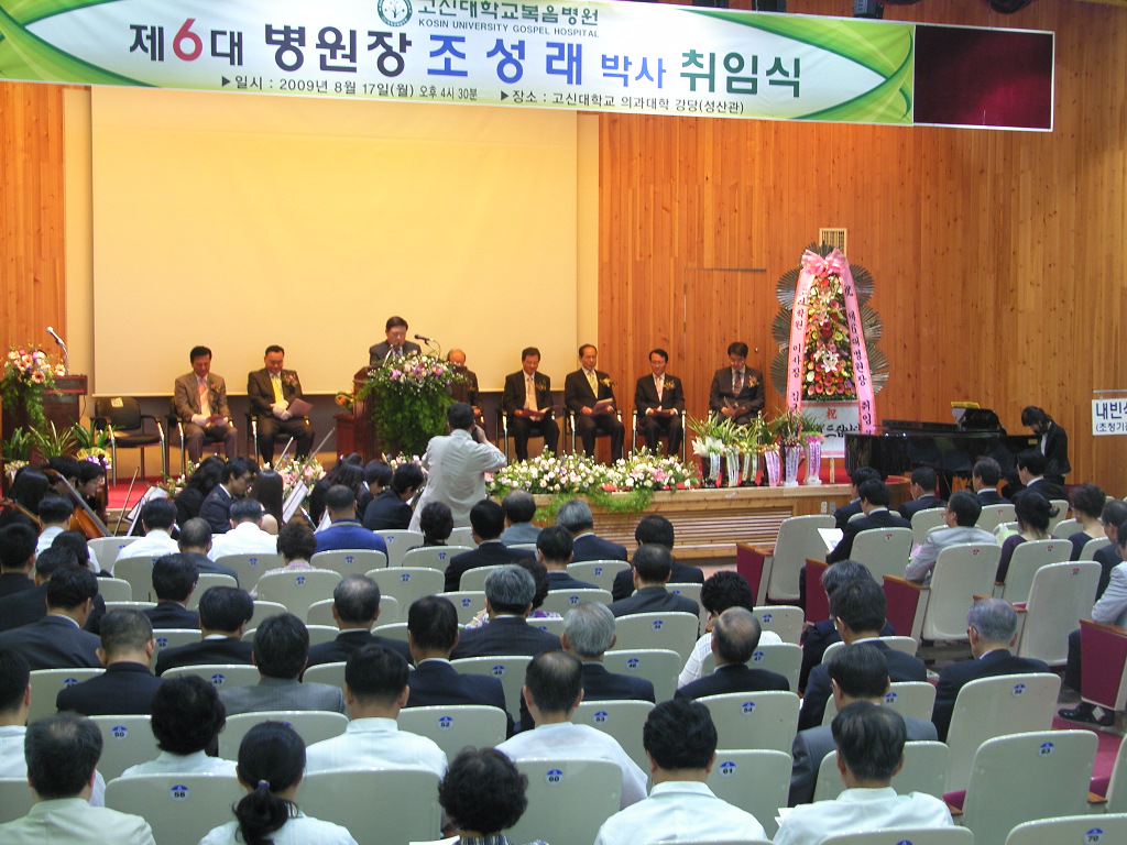 °í½Å´ëÇб³º¹À½º´¿ø Á¦6´ë º´¿øÀå Á¶¼º·¡ ¹Ú»ç ÃëÀÓ½ÄÀÌ 2009³â 8¿ù 17ÀÏ(È) °í½Å´ëÇб³ Àǰú´ëÇÐ ´ë°´ç¿¡¼ ¿·È´Ù. ÀÌ¿ëÈ£ °í½Å ÃÑȸÀåÀ» ºñ·ÔÇÑ ±³´ÜÁöµµÀÚµé°ú ¼³µ¿±Ù ºÎ»ê½Ã±³À°°¨, Á¤±Ù ºÎ»ê½ÃÀÇ»çȸÀå, ¹Ú±ØÁ¦ ºÎ»ê¼±¸Ã»Àå µî ¿ø³»¿Ü ±Íºó 300¿©¸íÀÌ Âü¼®ÇÑ °¡¿îµ¥ °í½ÅÀÇ´ë °üÇö¾Ç´ÜÀÇ ¿¬ÁÖ·Î ½ÃÀ۵ƴÙ.