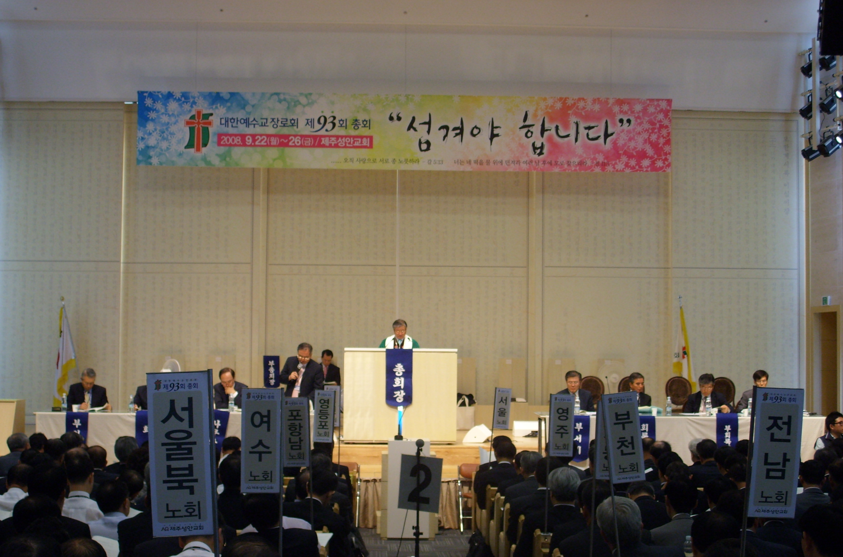Çѱ¹±³È¸¿¬ÇÕ°ú ÀÏÄ¡-±è»ïȯ ÃÑȸÀåÀÌ ÇÕµ¿, ±âÀå, ÇÕÁ¤, °í½Å, Çսű³´Ü ÃÑȸÀå°úÀÇ °´Ü±³·ù¸¦ ÅëÇØ ¿¬ÇÕ°ú ÀÏÄ¡¿îµ¿¿¡ Àü³äÇÏ´Â °¡¿îµ¥, ±Ý¹ø ÃÑȸ¿¡¼ ÇÕµ¿Á¤Åë(ÀÌÇÏ ÇÕÁ¤)°úÀÇ ±³´Ü ÅëÇÕ ¹®Á¦°¡ ³íÀÇµÉ °ÍÀ¸·Î º¸ÀδÙ. ÇÕÁ¤ÀÇ °æ¿ì ÃÖ±Ù ¸î ³â µ¿¾È Ÿ ±³´Ü°úÀÇ ÅëÇÕ¹®Á¦°¡ ¸îÂ÷·Ê ºÒ°ÅÁ® ³ª¿Â ¹Ù ÀÖ´Ù. ±Ý¹ø ÅëÇÕÃø°úÀÇ ±³´ÜÅëÇÕÀÇ °æ¿ì ºÎ»ê¿µ¶ô±³È¸ ¿µÀÔ¹®Á¦¿Í ¸Â¹°·Á ÀÖ¾î, ±³´ÜÅëÇÕÀ» À§ÇÑ Çຸ°¡ °¡½ÃÈ µÉ °ÍÀ¸·Î º¸ÀδÙ. ÃÑȸÀÓ¿øÈ¸µµ ¡®Àå·Î±³´Ü ÅëÇÕÀ» À§ÇÑ À§¿øÈ¸(À§¿øÀå ¹ÚÁ¾¼ø ¸ñ»ç)¸¦ ±¸¼ºÇÑ »óű⠶§¹®¿¡ ±Ý¹ø ÃÑȸ¿¡¼ ¶ß°Å¿î À̽´°¡ µÉ Àü¸ÁÀÌ´Ù.