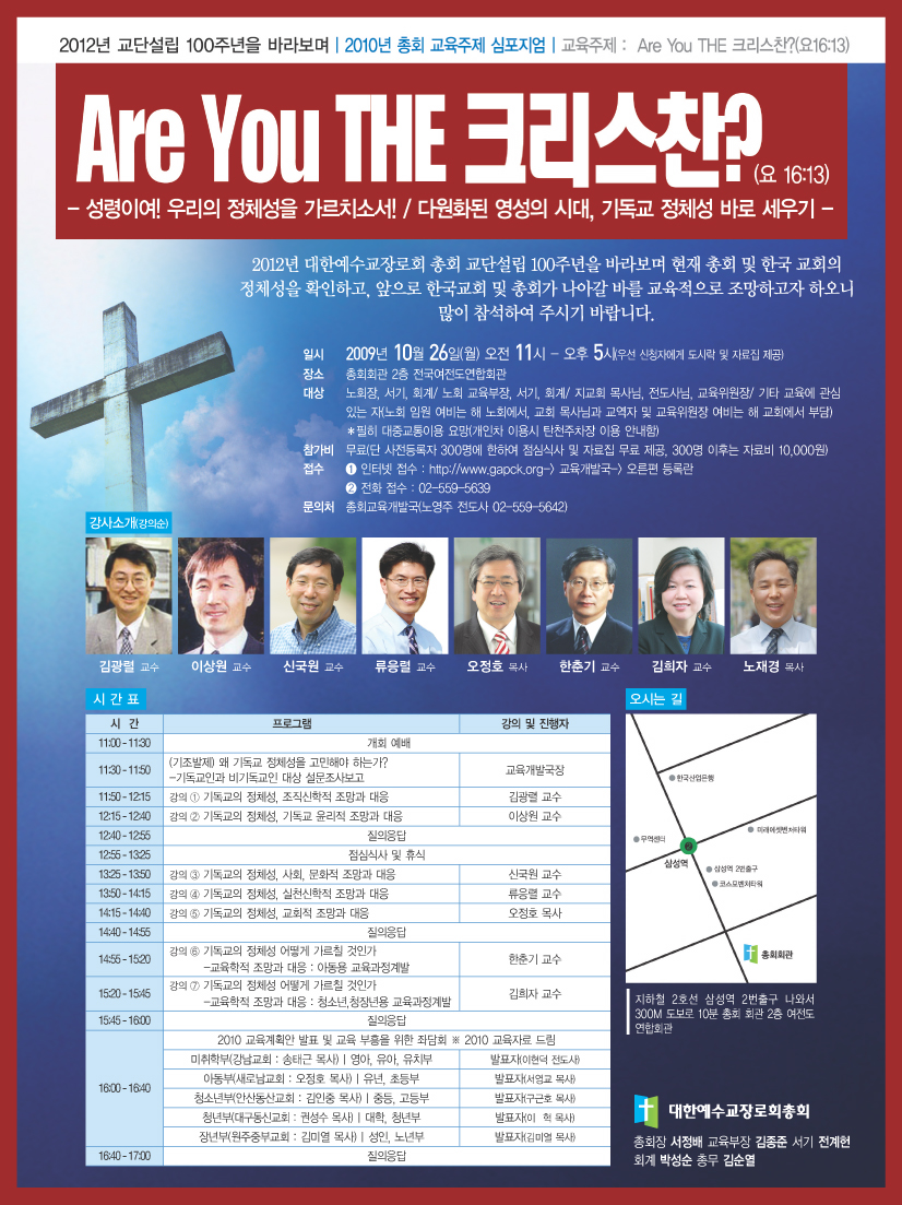 2012³â ´ëÇÑ¿¹¼ö±³Àå·ÎȸÃÑȸ ±³´Ü¼³¸³ 100ÁÖ³âÀ» ¹Ù¶óº¸¸ç ÇöÀç ÃÑȸ ¹× Çѱ¹ ±³È¸ÀÇ Á¤Ã¼¼ºÀ» È®ÀÎÇϰí, ¾ÕÀ¸·Î Çѱ¹ ±³È¸ ¹× ÃÑȸ°¡ ³ª¾Æ°¥ ¹Ù¸¦ ±³À°À¸·Î Á¶¸ÁÇϱâ À§ÇÑ ¸ñÀûÀ¸·Î °³ÃֵǴ À̹ø ½ÉÆ÷Áö¾öÀº ±è±¤·Ä ±³¼ö, ÀÌ»ó¿ø ±³¼ö, ½Å±¹¿ø ±³¼ö, ·ùÀÀ·Ä ±³¼ö, ÇÑÃá±â ±³¼ö, ±èÈñÀÚ ±³¼ö, ¿ÀÁ¤È£ ¸ñ»ç, ³ëÀç°æ ¸ñ»ç°¡ ÁÖ °»ç·Î ³ª¼ ±âµ¶±³ÀÇ Á¤Ã¼¼ºÀ» ¹ÙÅÁÀ¸·Î ´Ù¾çÇÑ ÁÖÁ¦·Î ÁøÇàÇÑ´Ù.