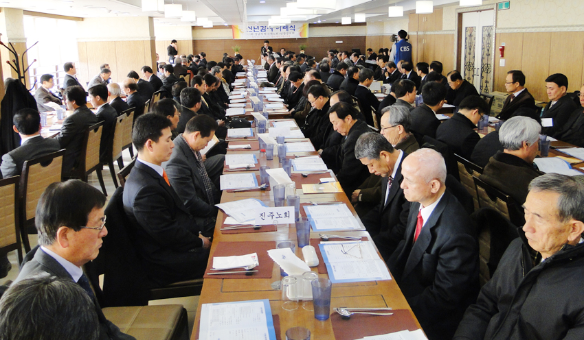 1¿ù 3ÀÏ(¿ù) ¿ÀÀü 11½Ã ¸¶»ê ´ë¿ì¹éÈÁ¡ 19Ãþ ±×·£µåȦ¿¡¼ °í½Å °æ³²Áö¿ªÀå·Îȸ¿¬ÇÕȸ ÁÖ°üÀ¸·Î °æ³² 9°³³ëȸ ÀÓ¿ø ¹× Àå·Îȸ ÀÓ¿ø ¸ñ»ç, Àå·Î 250¿©¸íÀÌ Âü¼®ÇÑ °¡¿îµ¥ ¡®2011 ½Å³âÇÏ·Ê °¨»ç¿¹¹è¡¯¸¦ µå·È´Ù.