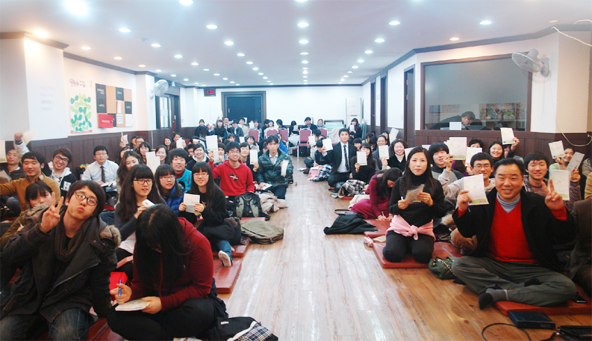 50¿©Æò ³²ÁþÇÑ °ø°£¿¡ 100¿©¸íÀÇ ´ëÇлý°ú ÀþÀº û³âµéÀÌ ¸¶·í¹Ù´Ú¿¡ ¾É¾Æ ¿¹¹è¸¦ µå¸®°í ÀÖ¾ú°í Çϳª´ÔÀ» ÇâÇÑ ¶ß°Å¿î ¿±â·Î °¡µæÇß´Ù.