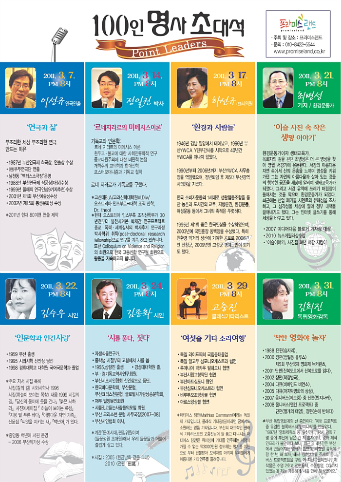 ÇÁ¶ó¹Ì½º·£µå´Â 3¿ùºÎÅÍ ¡®100ÀÎ ¸í»ç ÃÊ´ë¼®¡¯À» °³ÃÖÇÑ´Ù. 3¿ù ÇÑ´Þ°£¿¡´Â 8¸íÀÇ ¸í»çµéÀÌ °»ç·Î ³ª¼±´Ù. ¿À´Â 3¿ù ¡â7ÀÏ(¿ù) ¿ÀÈÄ 8½Ã À̼º±Ô ¿¬±Ø¿¬Ãâ°¡°¡ ¡®¿¬±Ø°ú »î¡¯, 14ÀÏ(¿ù) ¿ÀÈÄ 8½Ã Á¤À챂 ¹Ú»ç°¡ ¡®¸£³×Áö¶ó¸£ÀÇ ¹Ì¸Þ½Ã½º À̷С¯ ¡â17ÀÏ(¸ñ) ¿ÀÈÄ 8½Ã Çϼ±±Ô Àü ½ÃÀÇ¿øÀÌ ¡®È¯°æ°ú »ç¶÷µé¡¯ ¡â21ÀÏ(¿ù) ¿ÀÈÄ 8½Ã ÃÖº´¼º ±âÀÚ(ȯ°æ¿îµ¿°¡)°¡ ¡®À̽½ »çÁø ¼Ó ÀÛÀº »ý¸í À̾߱⡯ ¡â22ÀÏ(È) ¿ÀÈÄ 8½Ã ±è¼ö¿ì ½ÃÀÎÀÌ ¡®Àι®Çаú Àΰ£»ç¶û¡¯ ¡â24ÀÏ(¸ñ) ¿ÀÈÄ 8½Ã ±èÁ¾È ½ÃÀÎÀÌ ¡®½Ã¸¦ Ç®´Ù, Áþ´Ù¡¯ ¡â29ÀÏ(È) ¿ÀÈÄ 8½Ã °íÃæÁø Ŭ·¡½Ä±âŸ¸®½ºÆ®°¡ ¡®¿©¼¸ÁÙ ±âŸ ¼Ò¸®¿©Ç࡯ ¡â31ÀÏ(¸ñ) ¿ÀÈÄ 8½Ã ±èÈñÁø µ¶¸³¿µÈ°¨µ¶ÀÌ ¡®ÂøÇÑ ¿µÈ¾ß ³îÀÚ¡¯¶ó´Â Á¦¸ñÀ¸·Î °Á¸¦ ÁøÇàÇÑ´Ù.