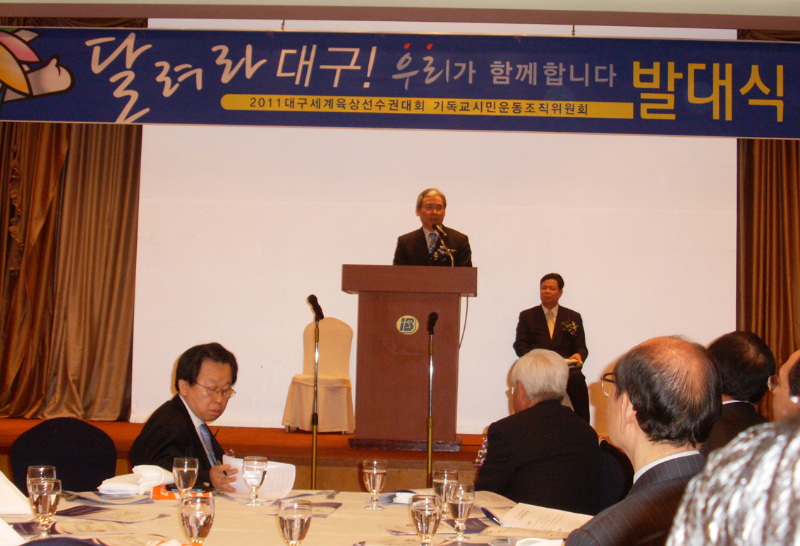 ¹ß´ë½Ä »çȸ´Â ¼ÛÇöÁÖ ¾Æ³ª¿î¼(KBS´ë±¸¹æ¼Û)°¡ ¸Ã¾ÒÀ¸¸ç, ¹ß´ë½ÄÀ» ÅëÇØ ´ë±¸±âµ¶±³ÃÑ¿¬ÇÕȸ ȸÀå ¹Ú¼ø¿À ¸ñ»ç(´ë±¸¼Çö±³È¸)°¡ ȯ¿µ»ç¸¦ ÀüÇß°í, 2011´ë±¸¼¼°èÀ°»ó¼±¼ö±Ç´ëȸ ±âµ¶±³½Ã¹Î¿îµ¿Á¶Á÷À§¿øÀå À̽ÂÈñ ¸ñ»ç (¹Ý¾ß¿ù±³È¸)°¡ ÁÖ¿äȰµ¿°èȹ¿¡ ´ëÇØ ¼³¸íÇß´Ù.