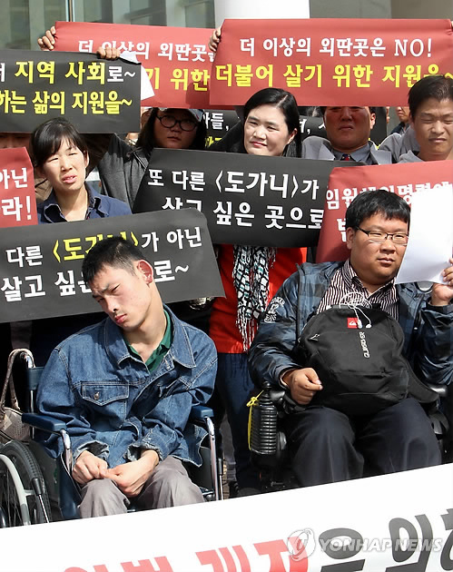 10¿ù 5ÀÏ(¼ö) ¿ÀÀü ±¤ÁÖ½Ãû ¾Õ¿¡¼ ½Ã¹Î¿îµ¿°¡µé°ú Àå¾ÖÀεéÀÌ ¡®¶Ç ´Ù¸¥<µµ°¡´Ï>°¡ ¾Æ´Ñ »ì°í ½ÍÀº °÷À¸·Î¡¯¶ó´Â ÇÇÄÏÀ» µé°í ÀÎÈÇб³ Æó±³¿Í ¹ýÀÎ Àΰ¡ Ãë¼Ò¸¦ Ã˱¸Çϰí ÀÖ´Ù.